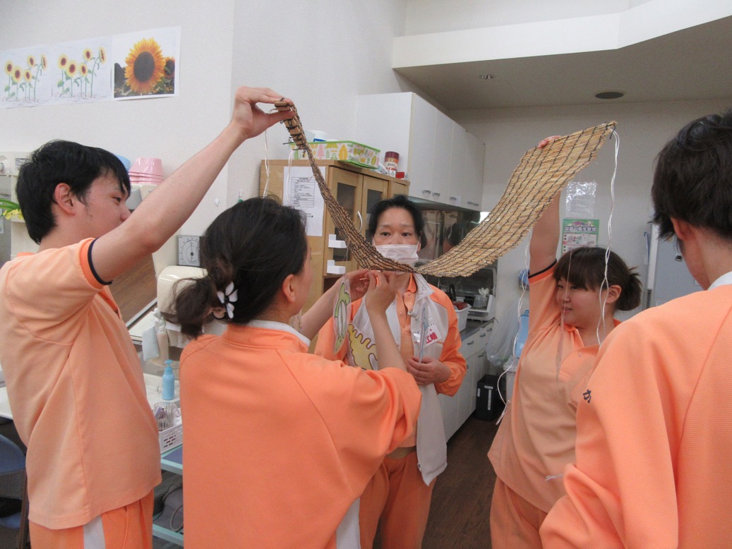 8月に入りまして夏本番!施設の天井にはすだれを利用したスタッフ手作りの天井飾りがつきました!!