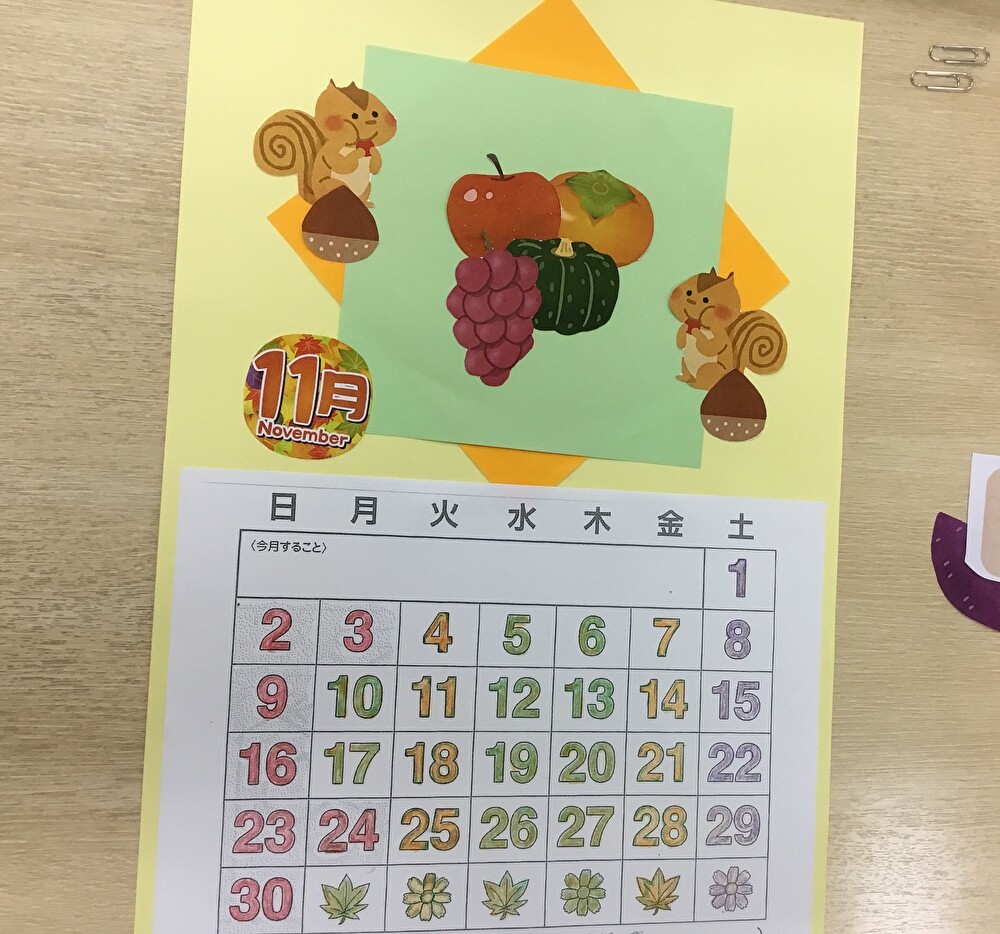 みなさま好きな色の折り紙に好きな果物のイラストを貼っていただきました。