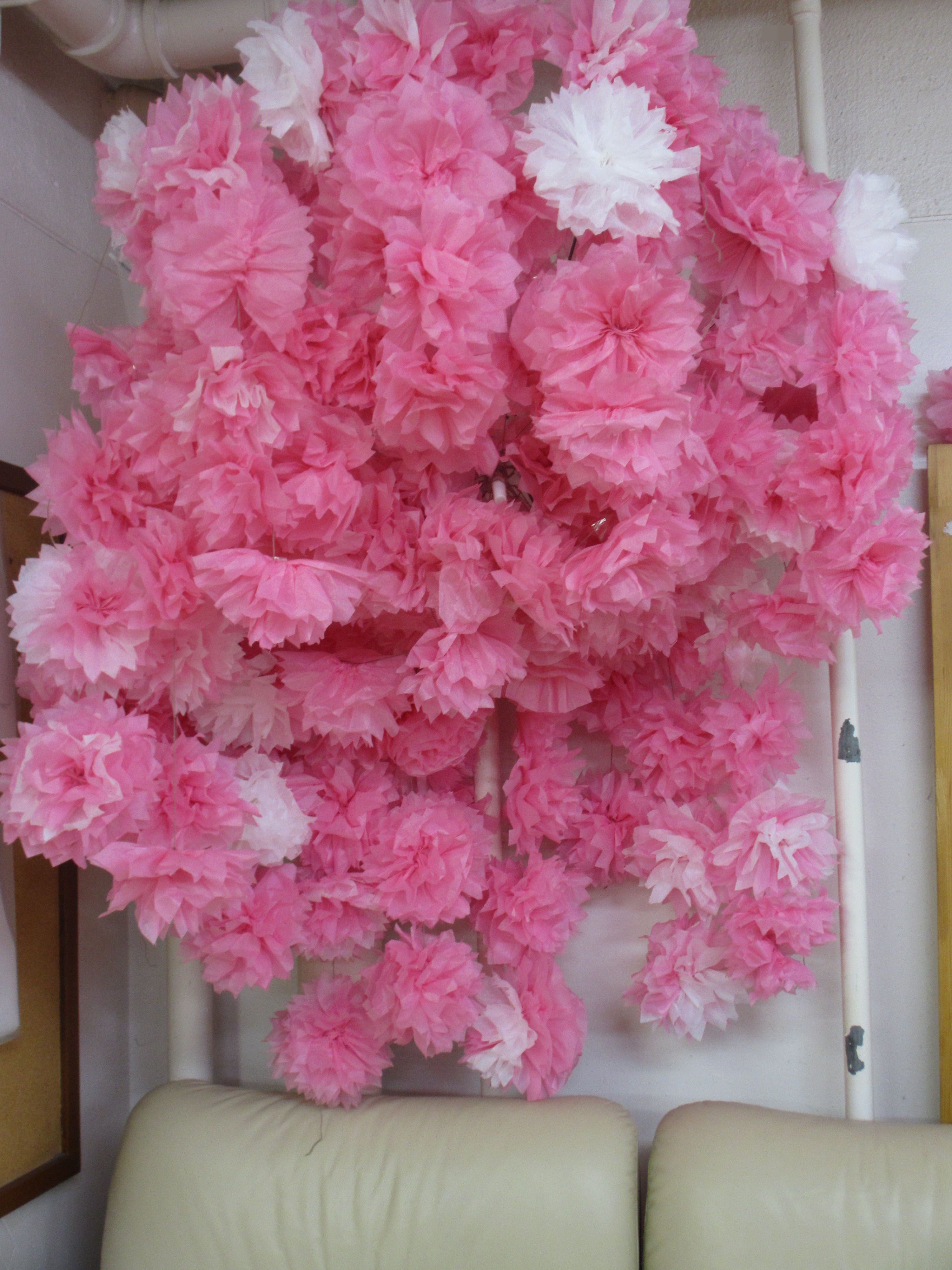 なごやか羽田にしだれ桜が咲きました♪ご利用者様が協力して一つ一つ作ってくださったしだれ桜はとても綺麗です!