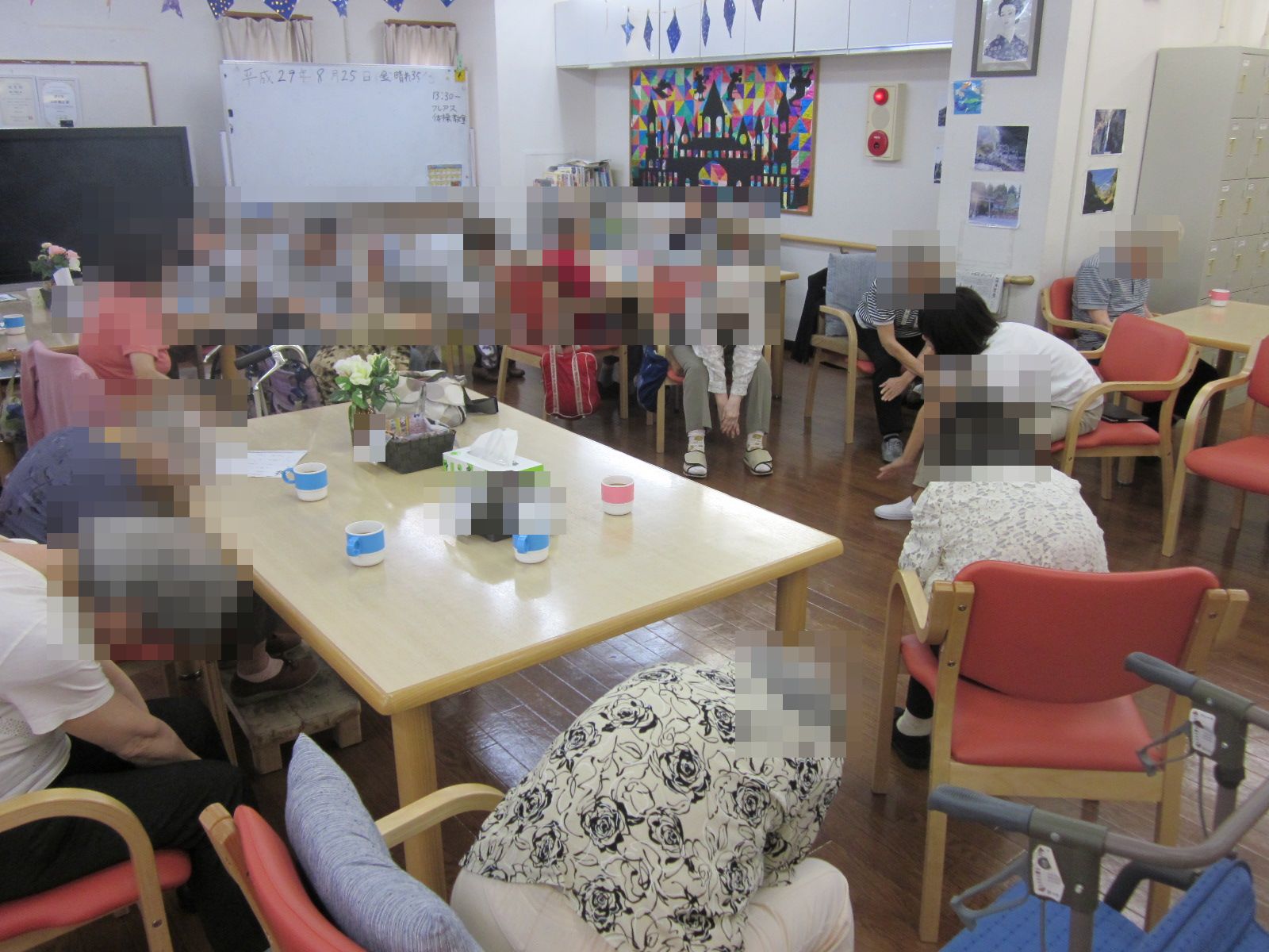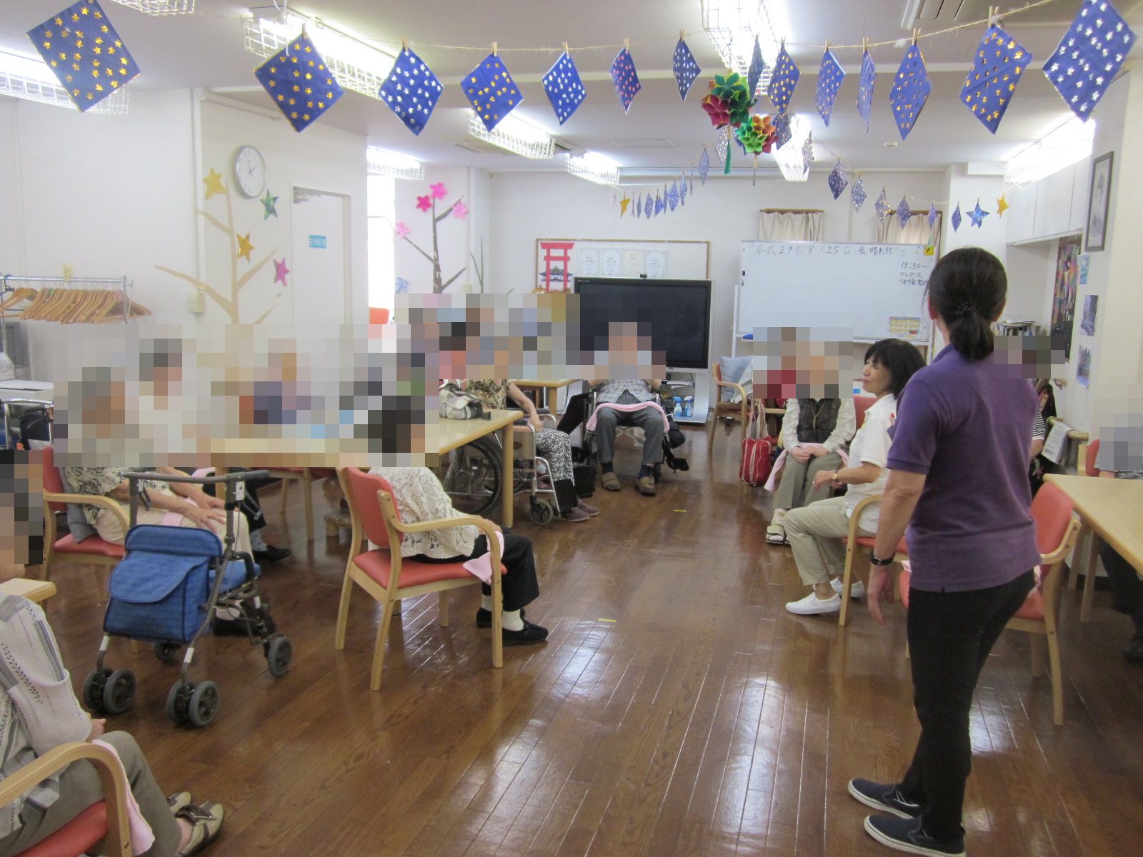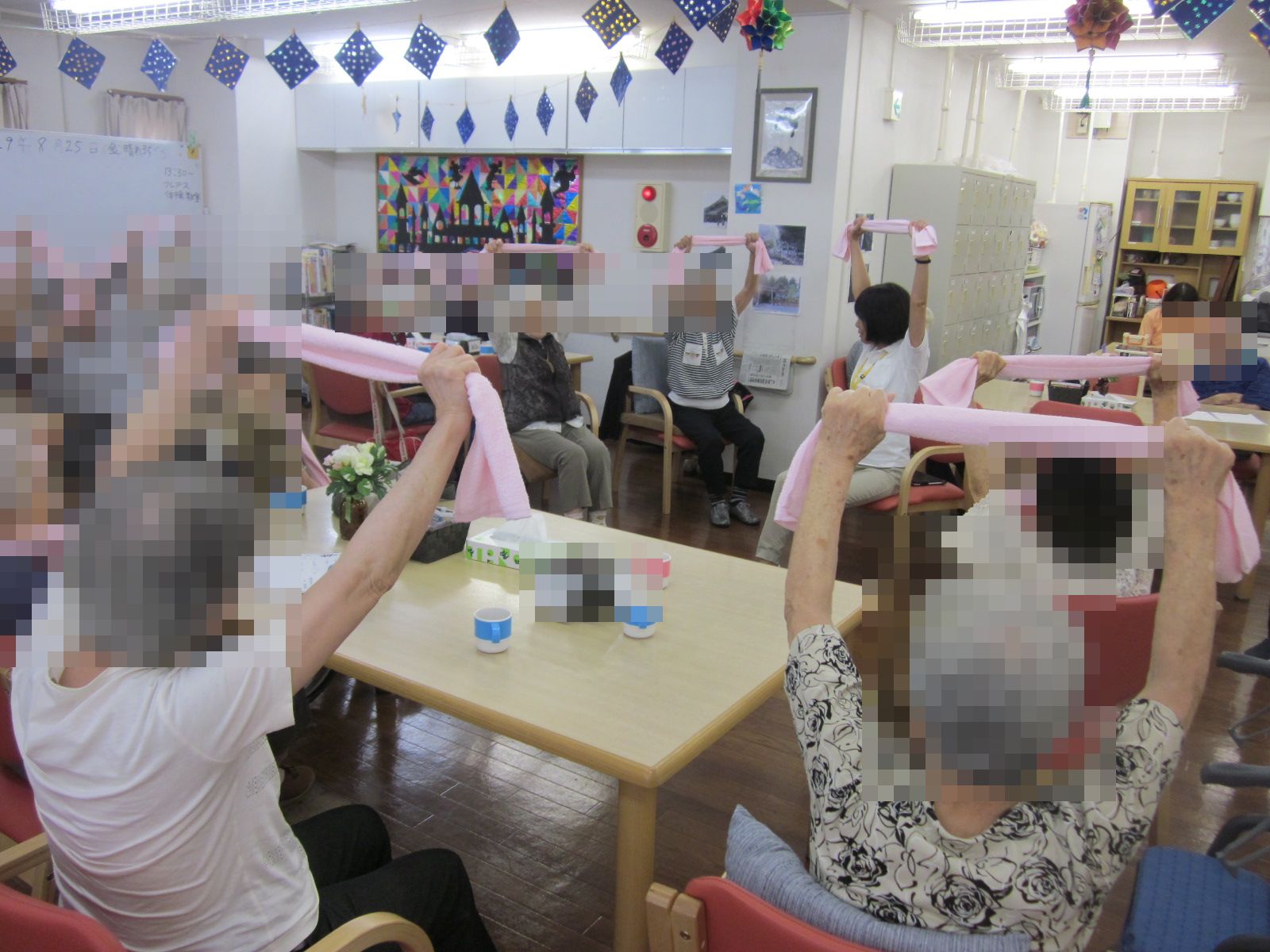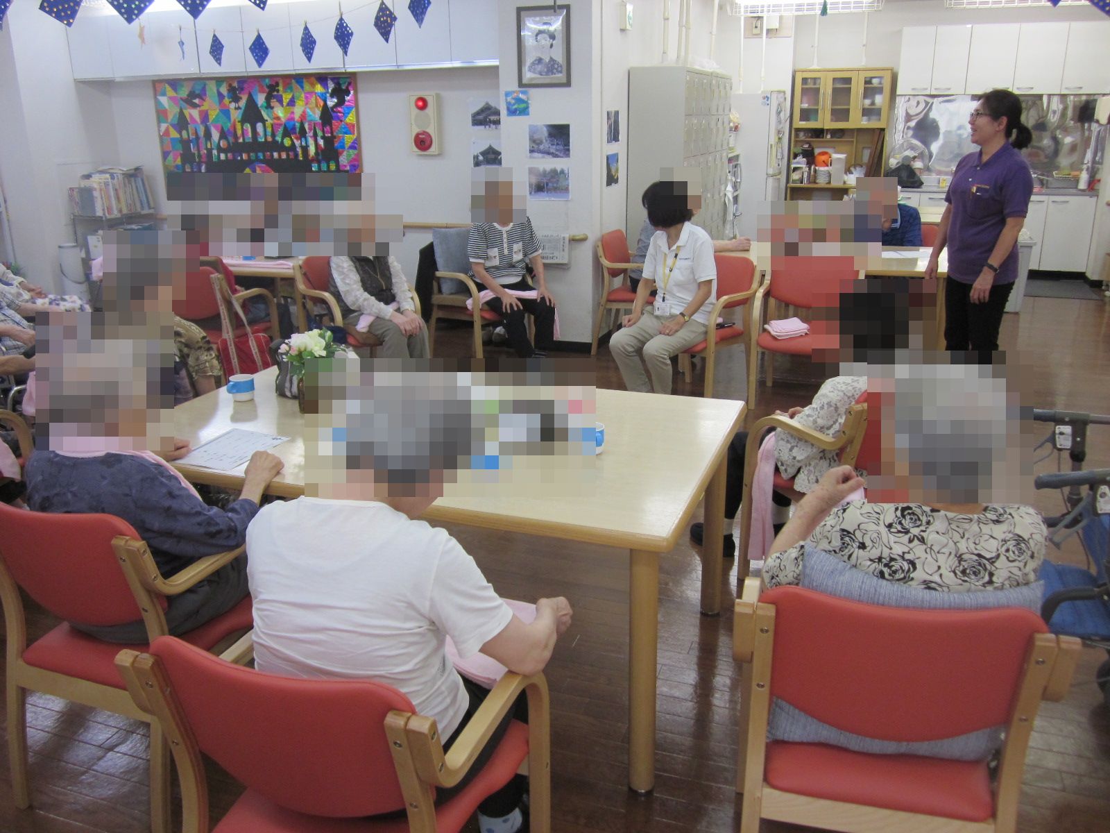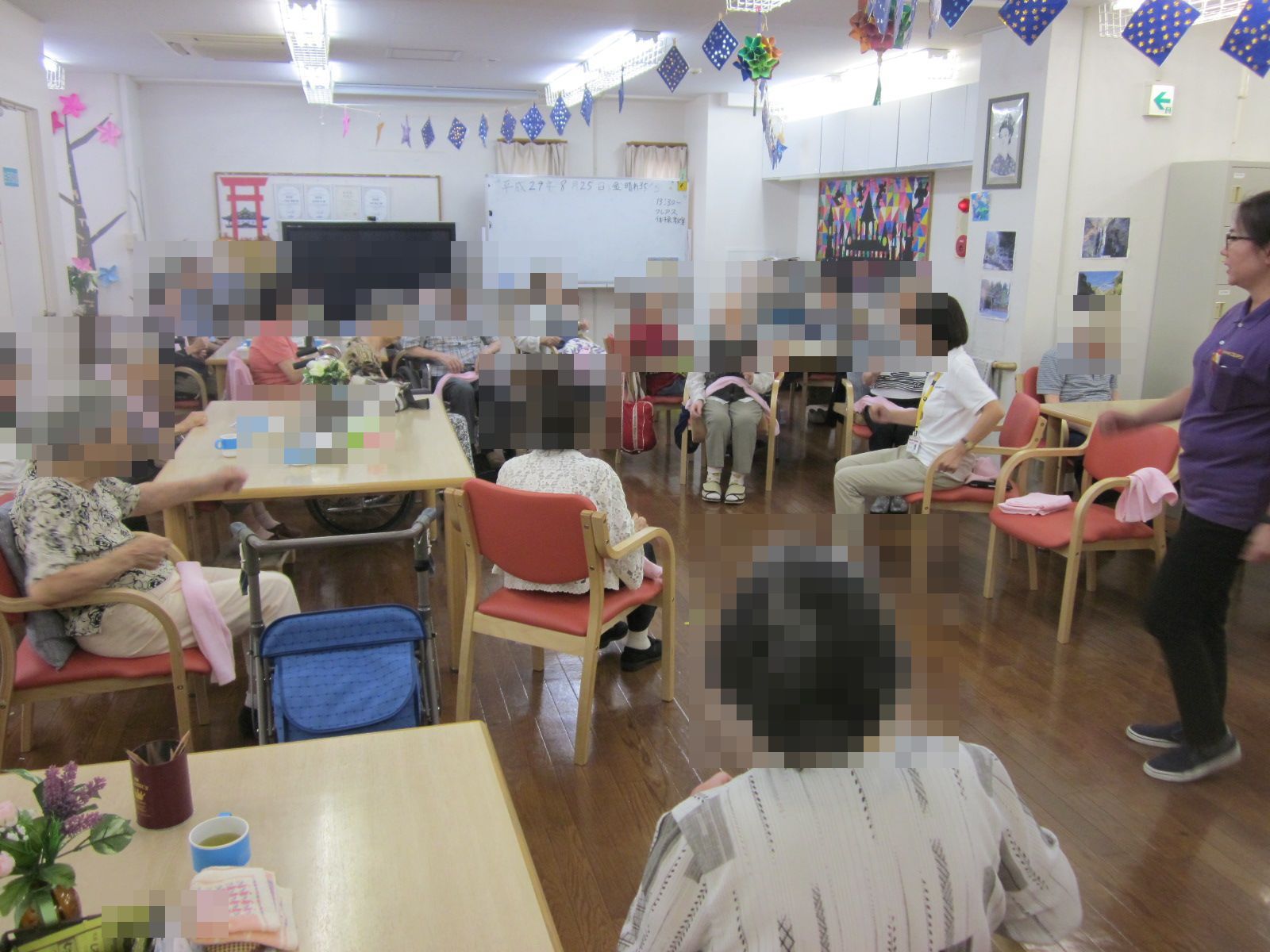いよいよ8月も最終週へと差し掛かりました。暑い、涼しいを繰り返す今日この頃ですが、体調いかがでしょうか?なごやかでは、今日フレアス株式会社様にご協力いただきまして、体操教室を実施致しました。普段とは違う体操にご利用者様も興味津々でした(#^.^#)。