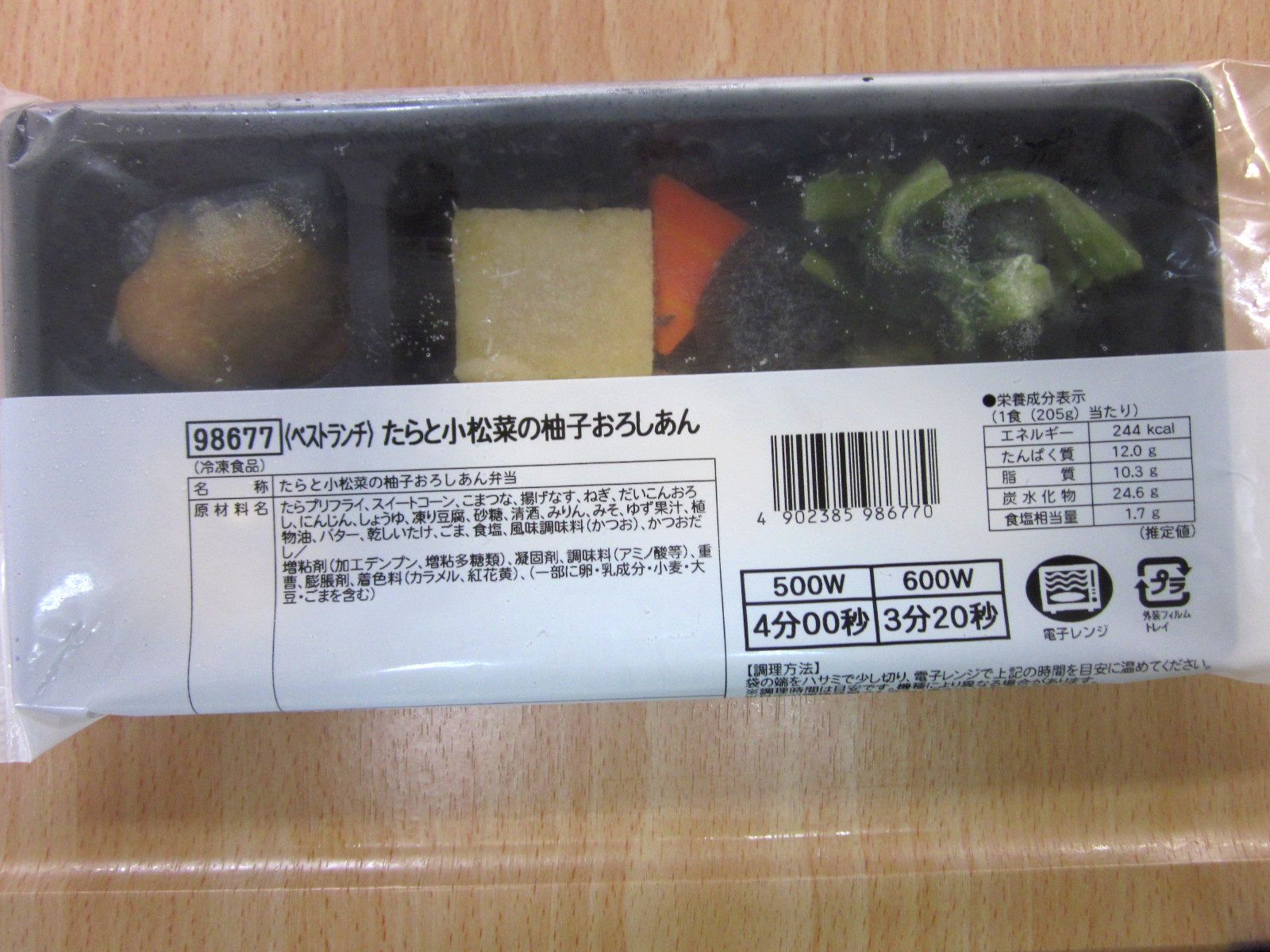 人気の「たらと小松菜の柚子おろしあん」です。野菜たっぷり、お魚は冷凍とは思えぬほど、ふっくらしています!しっかりとした味付けです。お値段は1つ583円(^^)利用料と一緒に口座引き落としなので、手間いらずですね♪ -