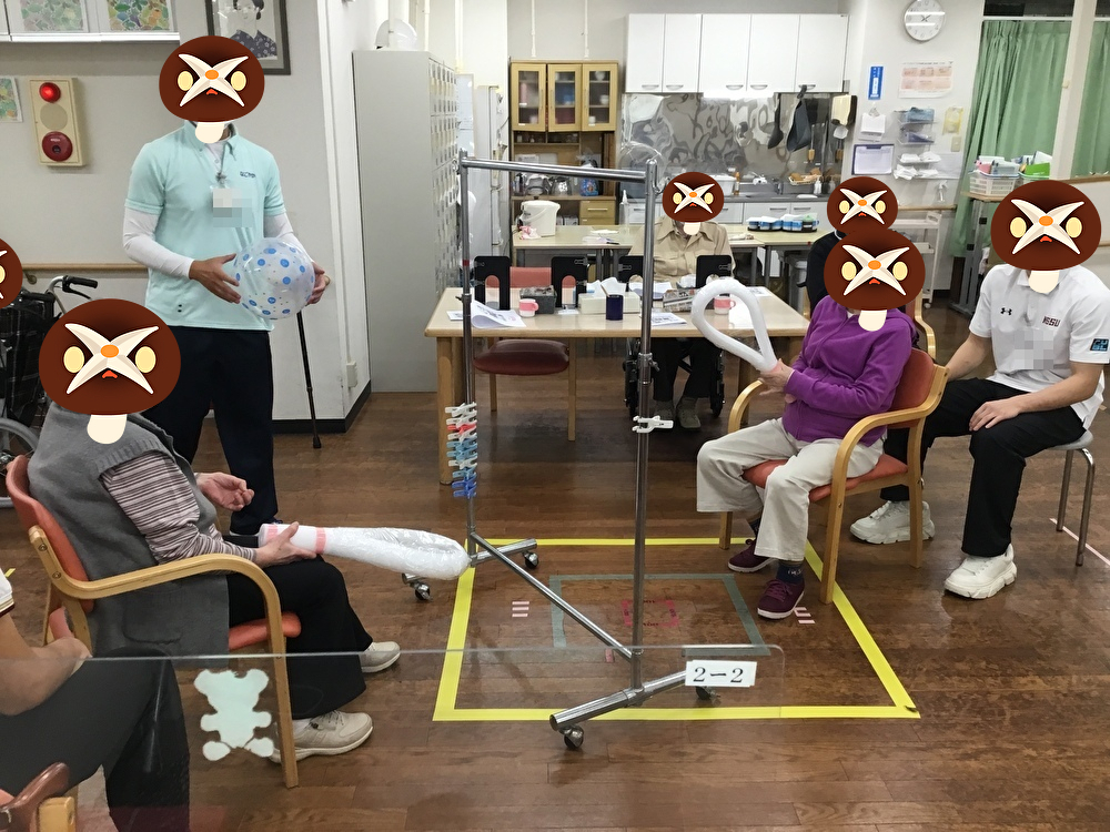 いろいろな運動レクを用意して、笑顔で毎日にぎわっています。
