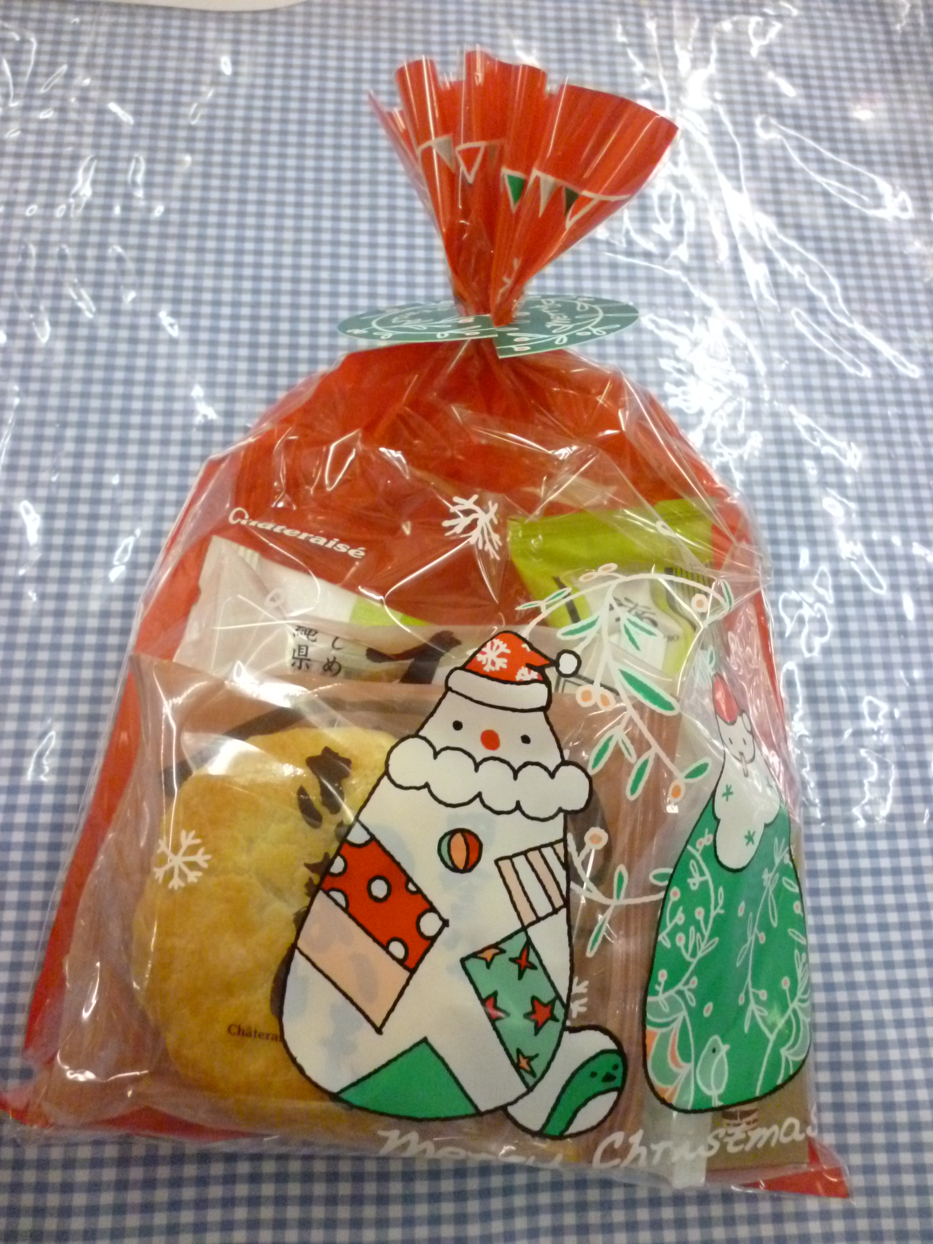 ビンゴになると安部トナカイがひもを引いてもらいプレゼントをお渡しします。