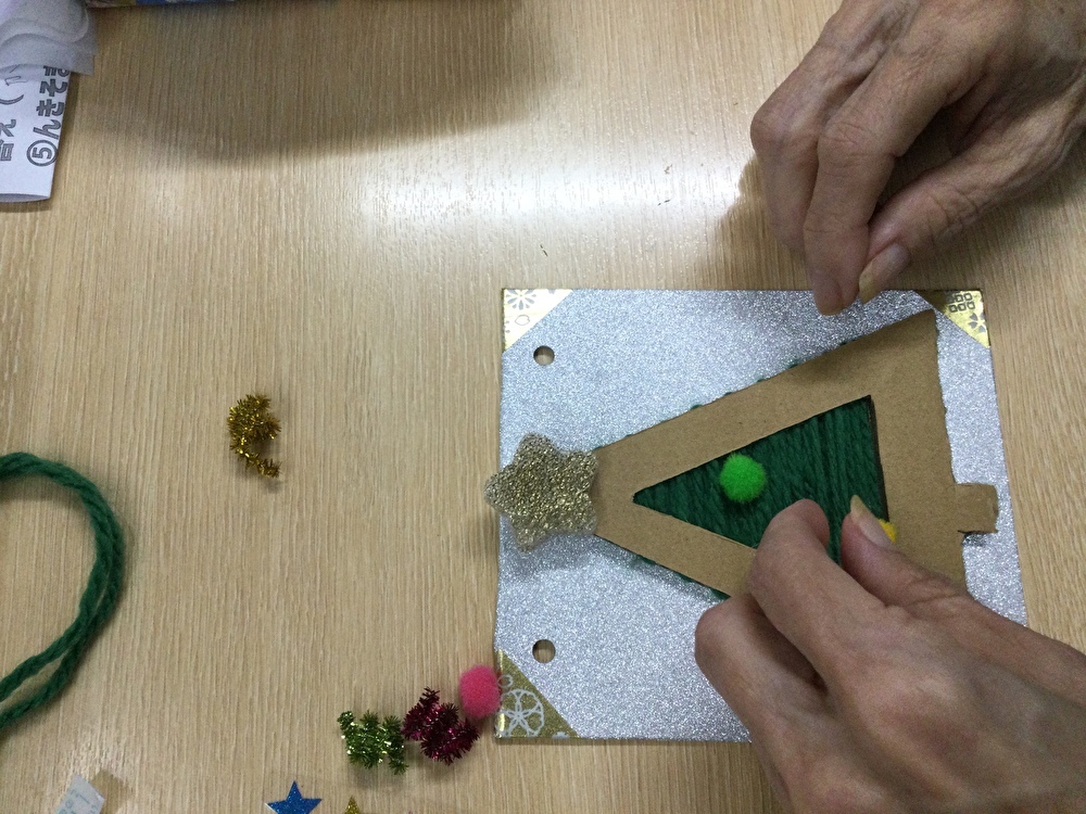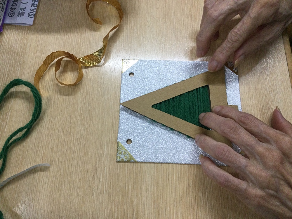 11/28(金)にクリスマスツリーの壁掛け飾りを作りました。毛糸を使用しながら利用者様好みの素敵な作品が出来ました。