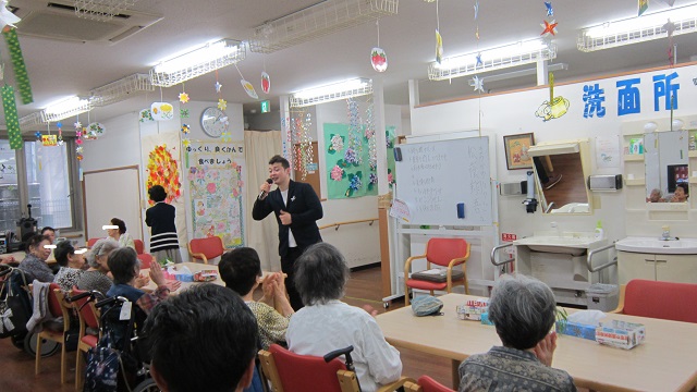 6月22日に演歌歌手の松陰翔吾さんという方が歌いに来て下さり皆様喜んで歌を聴いたり、一緒に歌ったりしていました