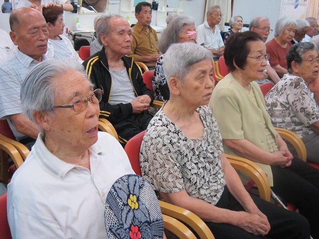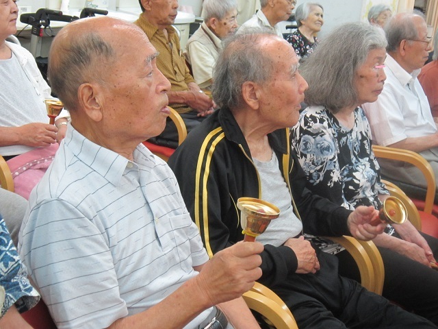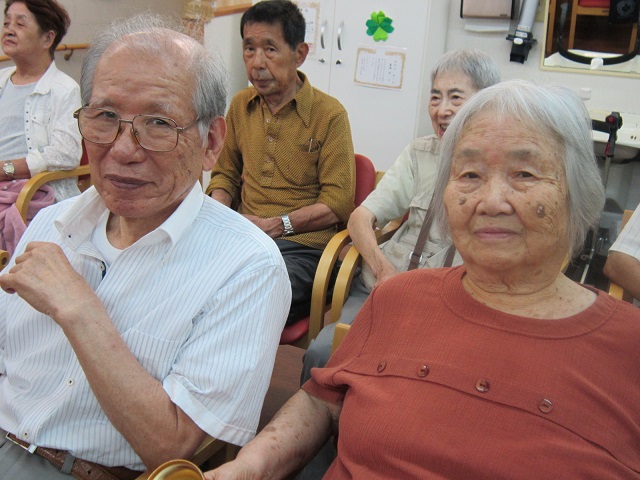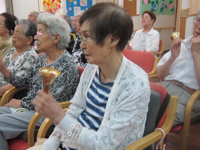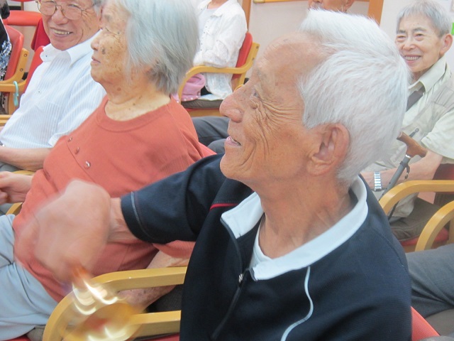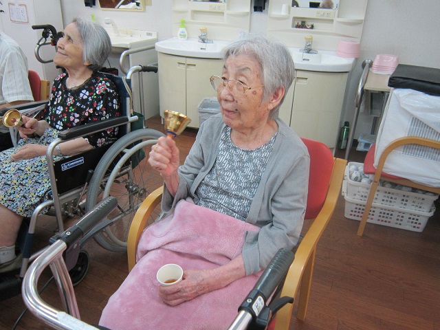 今日はボランティアの方が来てくださいました〜!歌唱、ハンドベルなど皆さんで一生懸命に取り組まれ、ステキな時間を過ごされました〜!皆さんでハンドベルです。 「出した色紙と同じ色のベルを持った人、鳴らしてください〜!」