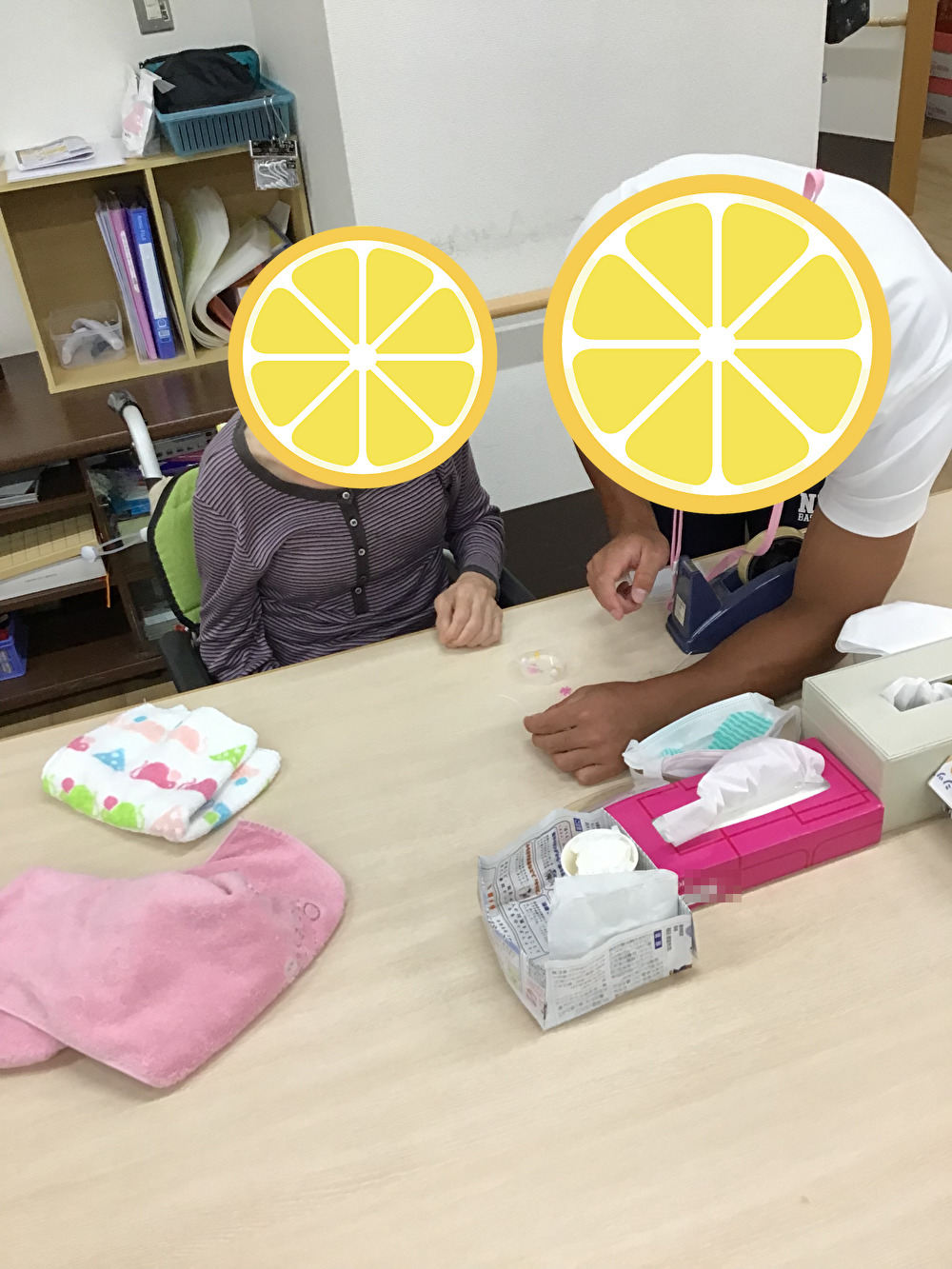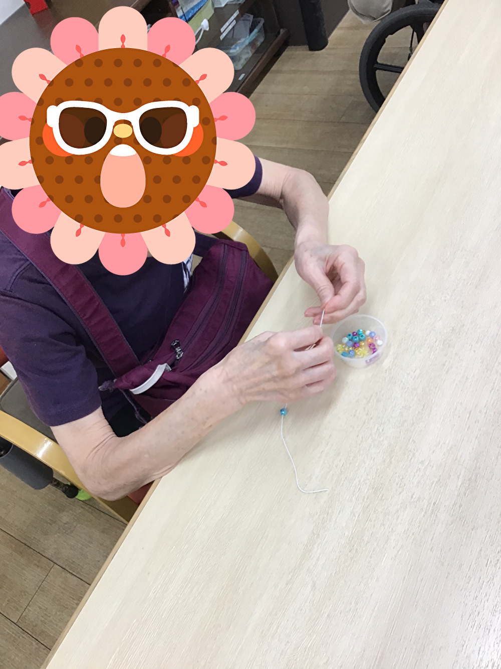 先日お客様がたくさんのビーズを持ってきてくださったので、施設にあるビーズと併せて全員でブレスレット作りを行いました。男性のお客様も女性のお客様も細かい作業に