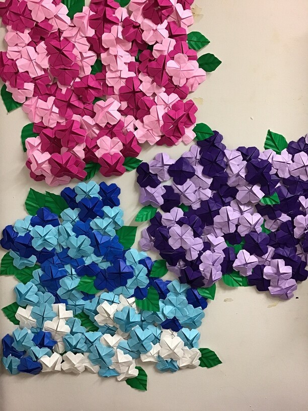 5月の藤に続き、6月はアジサイを利用者さんたちと作って皆さんが毎日見る、正面の壁(テレビの横)に飾りました。