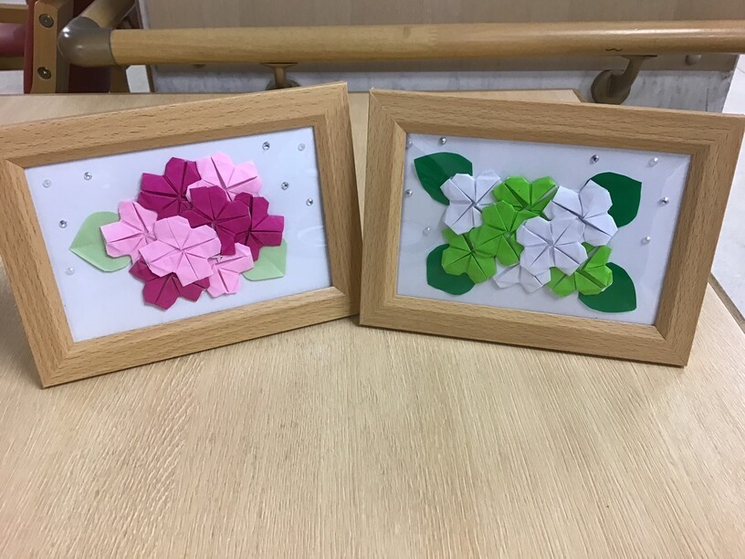 5月の藤に続き、6月はアジサイを利用者さんたちと作って皆さんが毎日見る、正面の壁(テレビの横)に飾りました。また、小さなアジサイはゲームの優勝者に差し上げました。