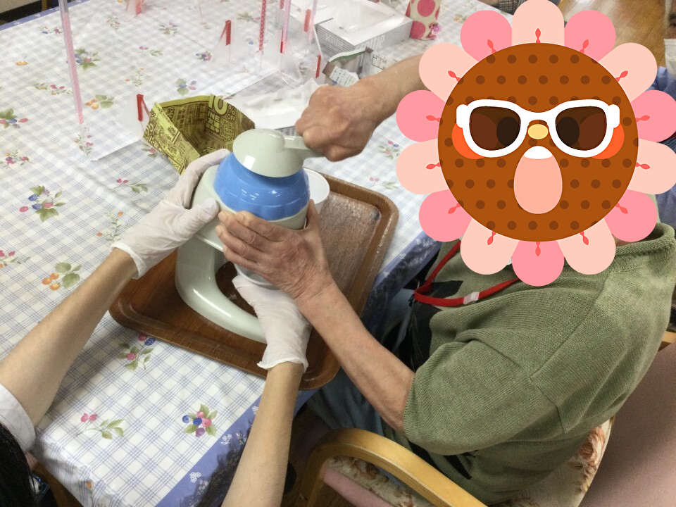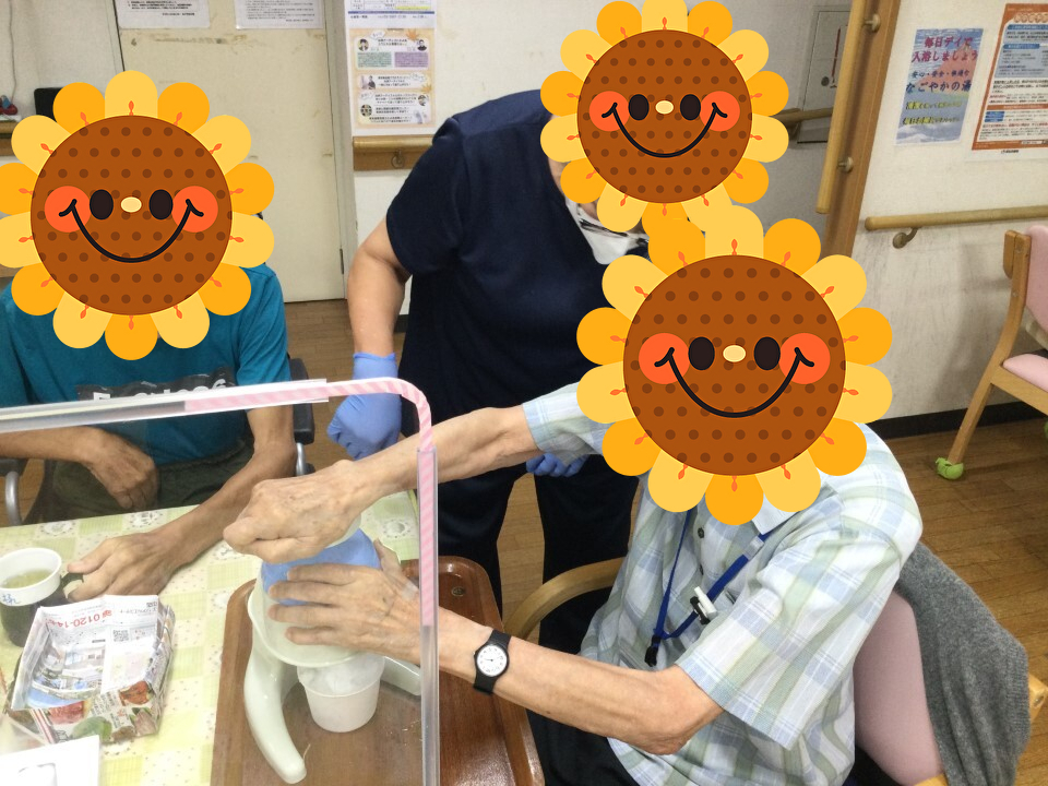 手作りかき氷機をご自分で回して頂き、お一人で難しい時は我々職員や介護等体験の学生がお手伝いして
