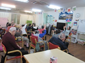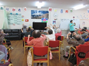 本日は簡単社交ダンス。利用者様も徐々に慣れ、手の身振りも綺麗に揃っていらっしゃいます。