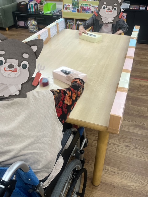 ティッシュの空き箱をラケット代わりに使った「お手玉ホッケー」で盛り上がりました!空き箱は軽くて幅があるため、力の弱い方でも扱いやすく、お手玉をしっかり受け止めて打ち返せるのがポイントです。