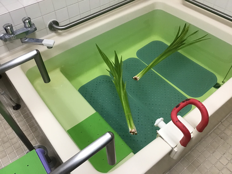 5月5日は菖蒲湯を開催致しました。皆様菖蒲の葉を持ち、