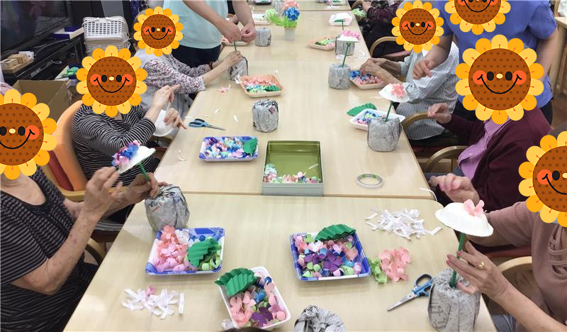 なごやか三軒茶屋では、あじさいとお客様の笑顔が咲き乱れました。スタッフとお客様と協力をし、色鮮やかなあじさいを作成いたしました。