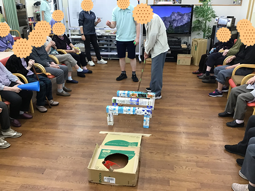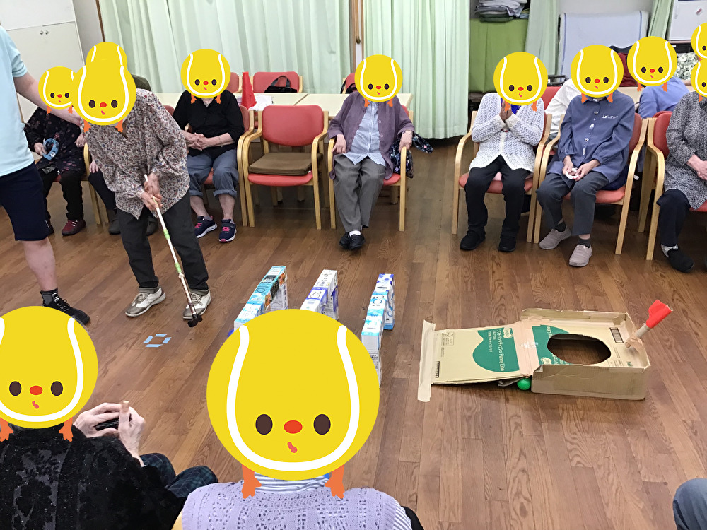 牛乳パックで作った3つのゲートをくぐらせて坂の上にある穴に入れる、ゲートボールとゴルフをミックスした、なごやか三軒茶屋の人気レクリエーション「ゲートゴルフ」!ゴルフ経験者もそうでない方も、みなさん楽しんで参加されています!