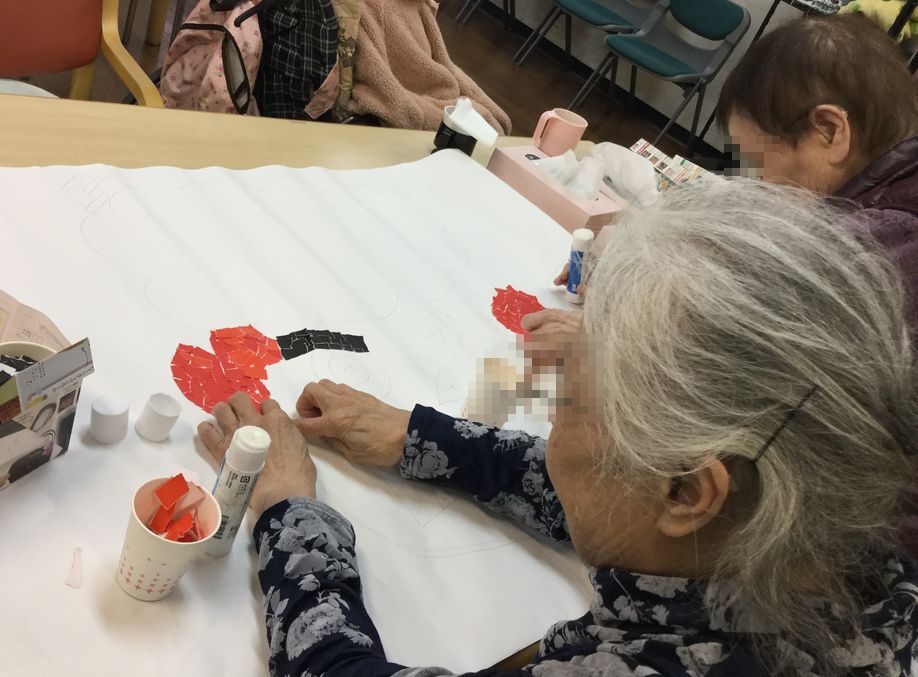 午後の空き時間の有効活用と、お客様の作業療法リハビリを兼ねて、毎月季節にちなんだ工作を行っています♪主にちぎり絵が中心なのですが、お客様のアイデアで折り紙を合わせて立体的な仕上がりになることも。