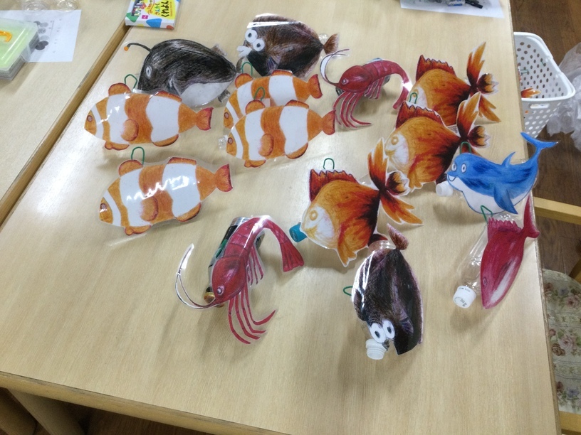 この魚たちは、全て利用者様の手書きで色はクレパスや色鉛筆で描かれています
