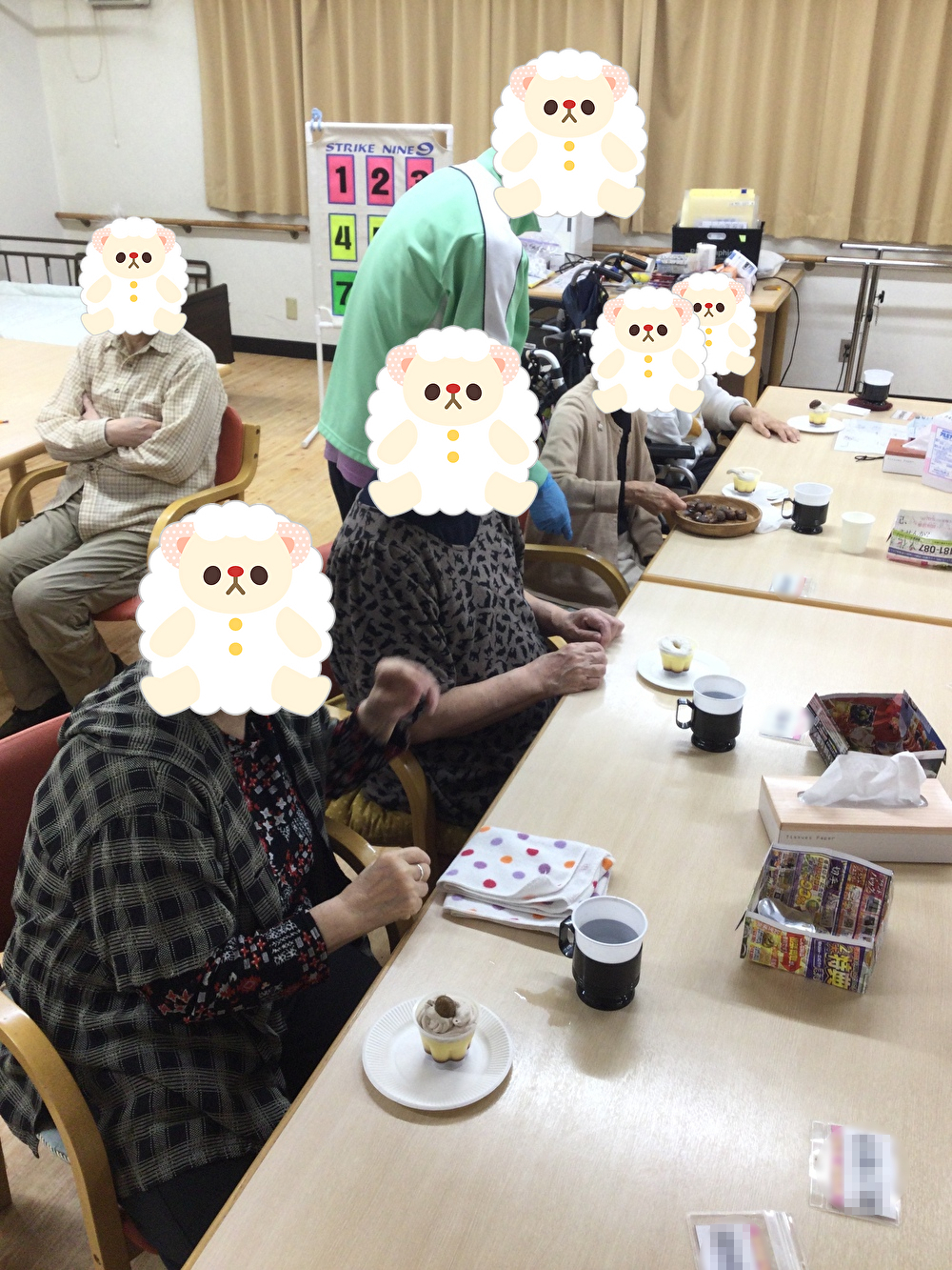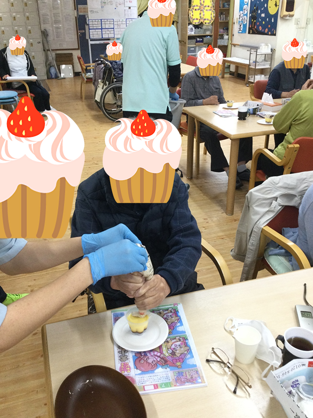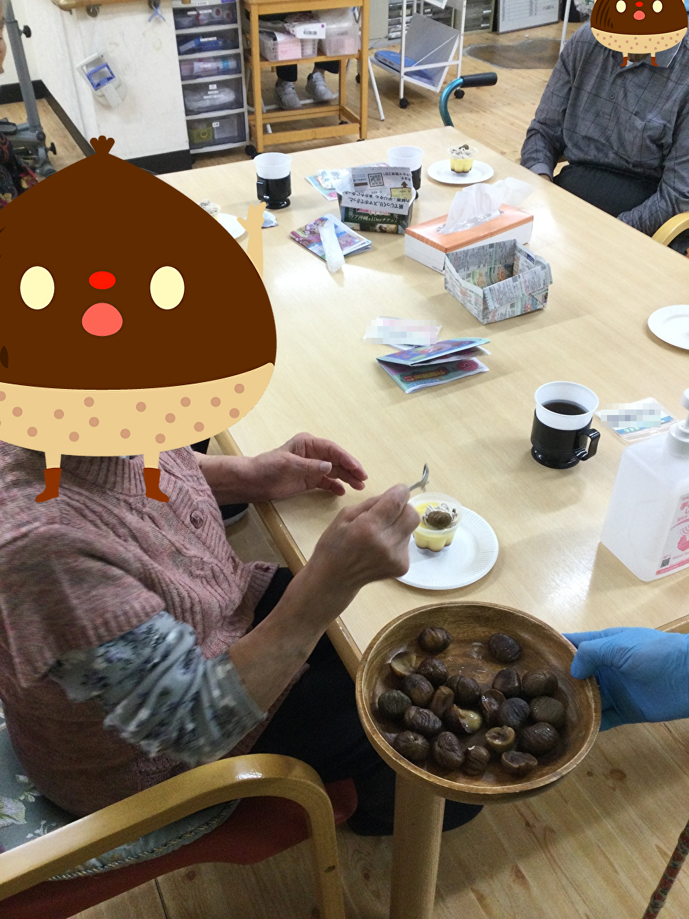 レクリエーションの時間に皆でモンブランを作りました。プリンをベースにマロンクリームと甘栗を利用者の皆さんに