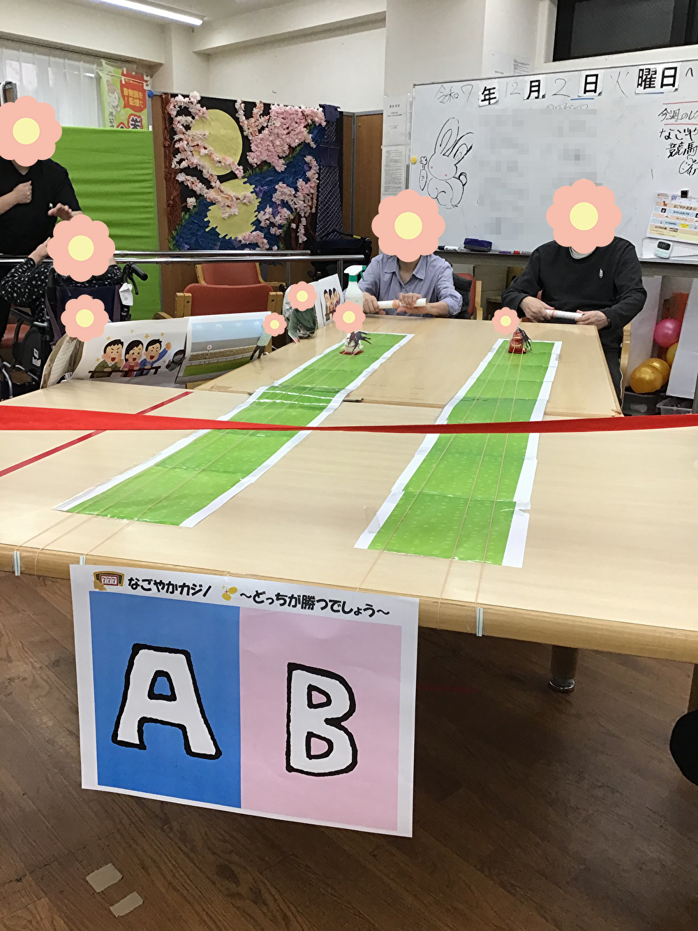 今回、なごやか砂町で競馬レースを開催いたしました!糸を巻いていくと馬がゴールに向かって進んでいく仕掛けです。