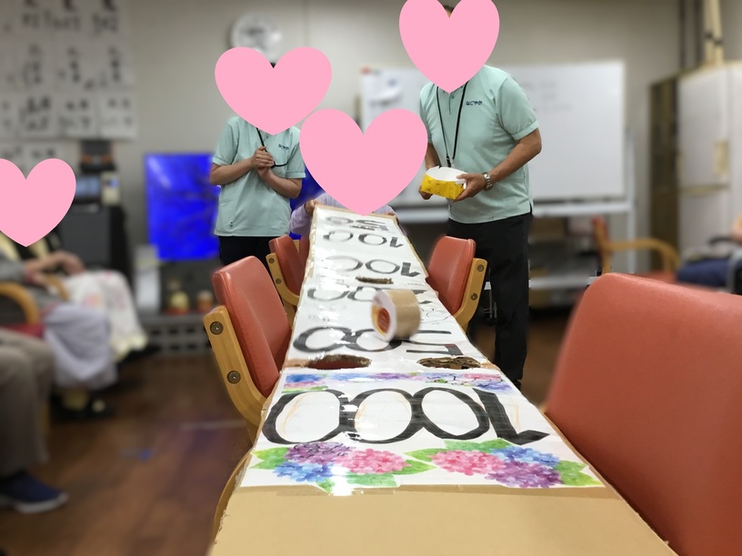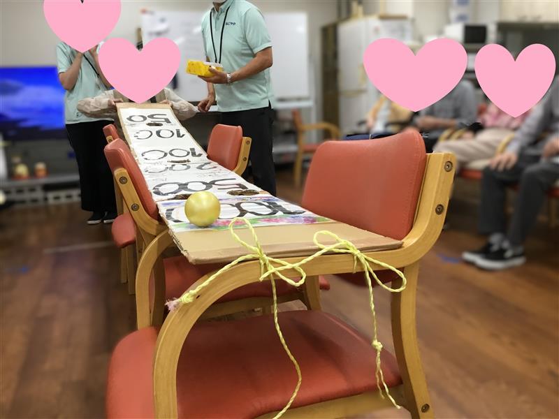 なごやか用賀では梅雨レクの一環としてカタツムリゲームを行いました!縦一直線の段ボール上のボールなどを床へ落とさない様に点数のところまで転がすゲームです😀