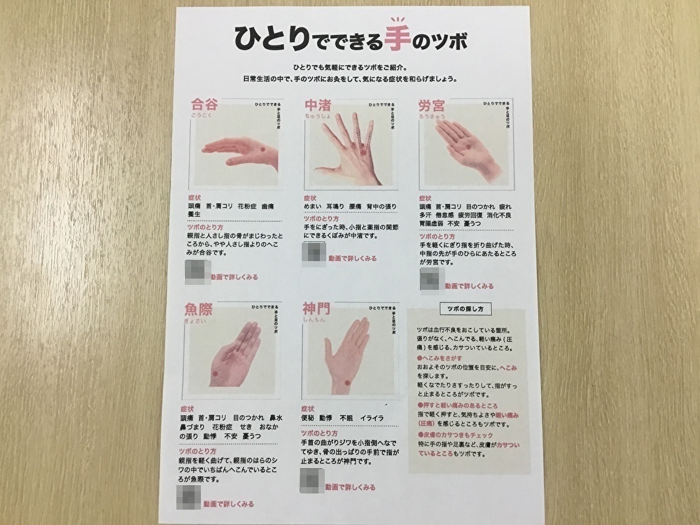 ボランティアの方々から頂いた、手のツボの表を写真にしましたのでみなさまも御覧になってください。