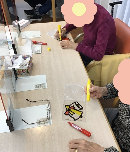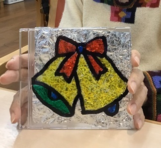2025年のクリスマスは、「ステンドグラス」作りにチャレンジしていただきました。CDケースの型の上からマジックで直線や面を慎重に塗り上げ、作品が出来上がりました。