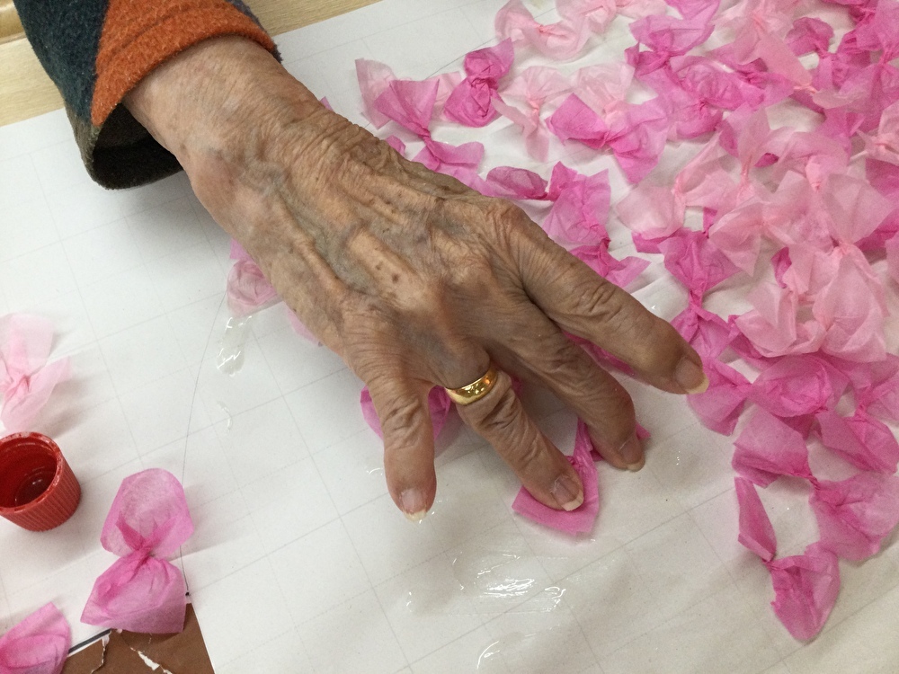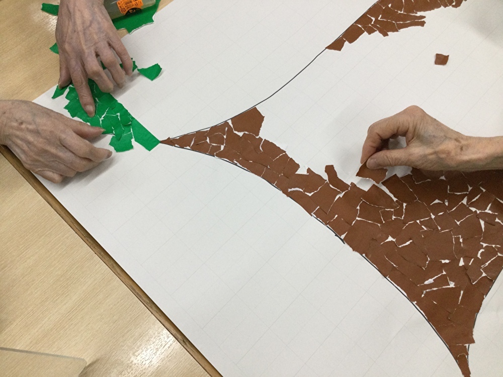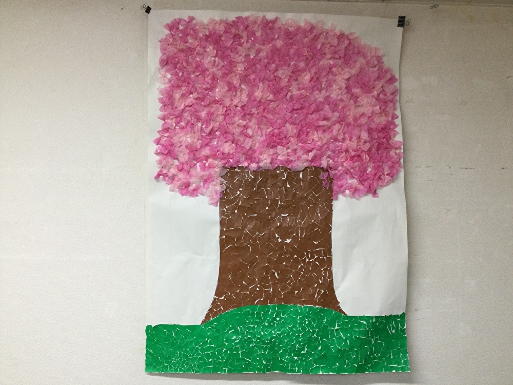 なごやか保土ヶ谷でもフロアに桜が咲きました。利用者様と一緒に作業をしていただき、とても綺麗な貼り絵が出来ました。