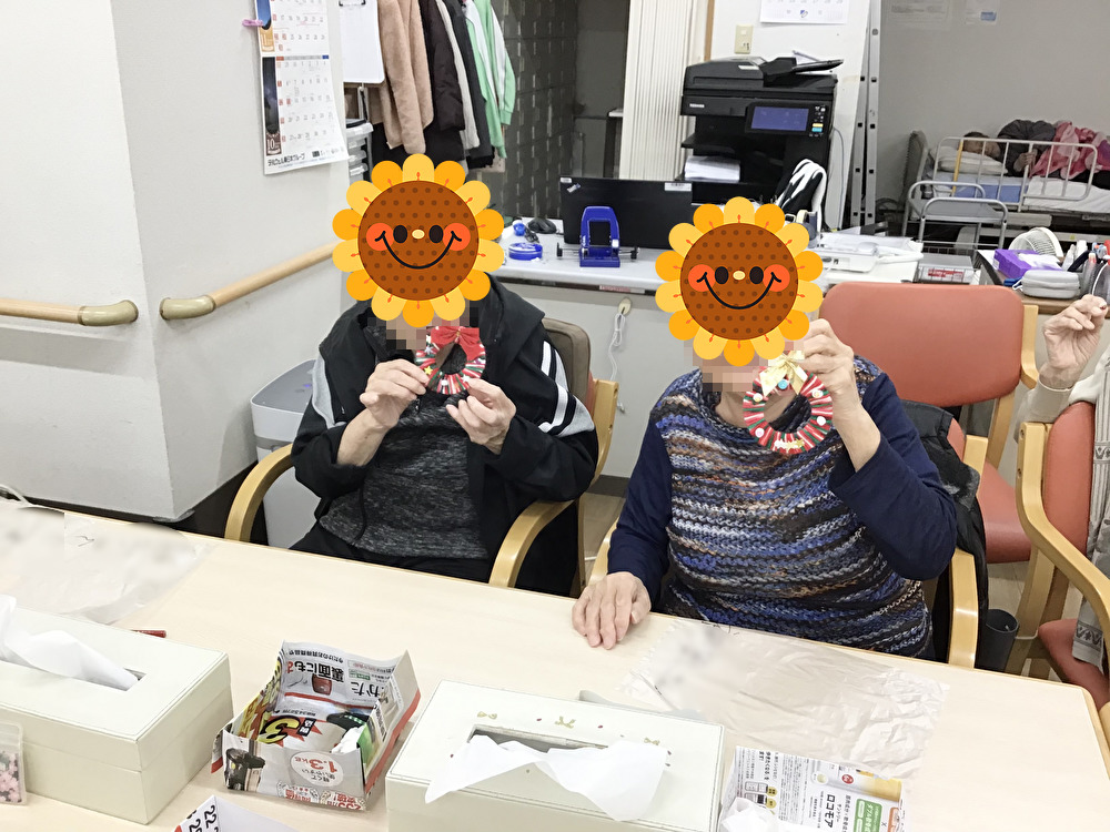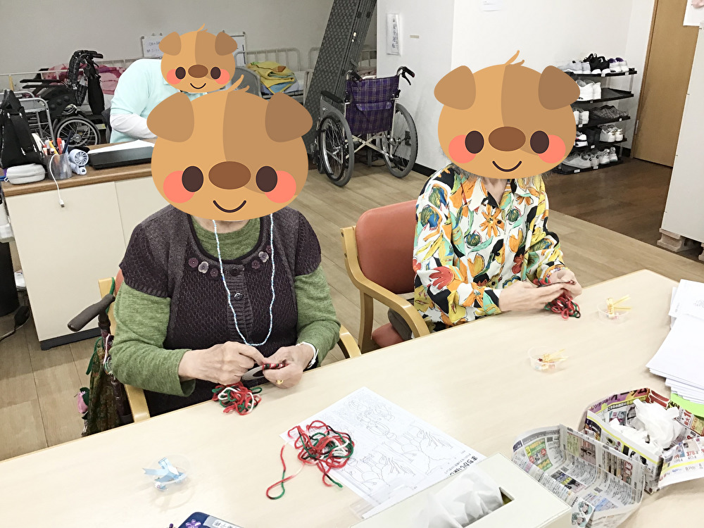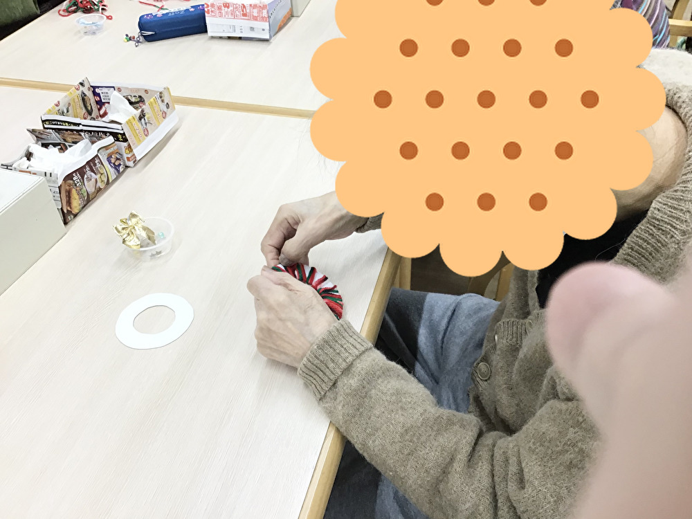 来月のクリスマスに向けてみんなでクリスマスリースを作りました。毛糸を切ったり、飾りを分けたりと、準備からお手伝いしていただきました。