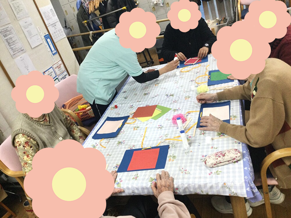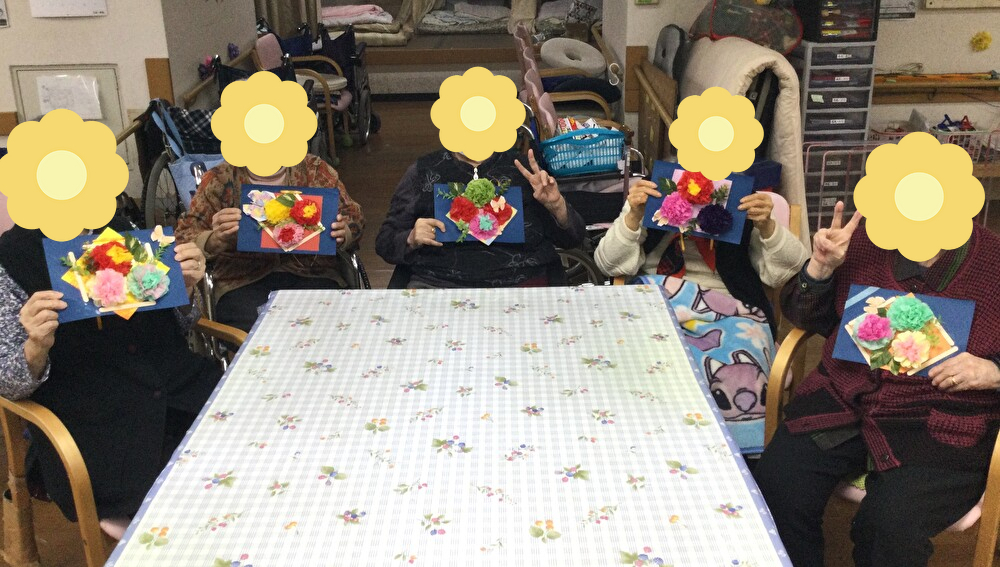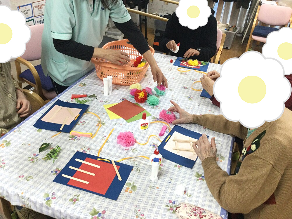 そこに職員やご利用者様の有志で作った花飾りや葉っぱ、茎等の小物を糊やボンドで思い思いに装飾していただき完成です♪