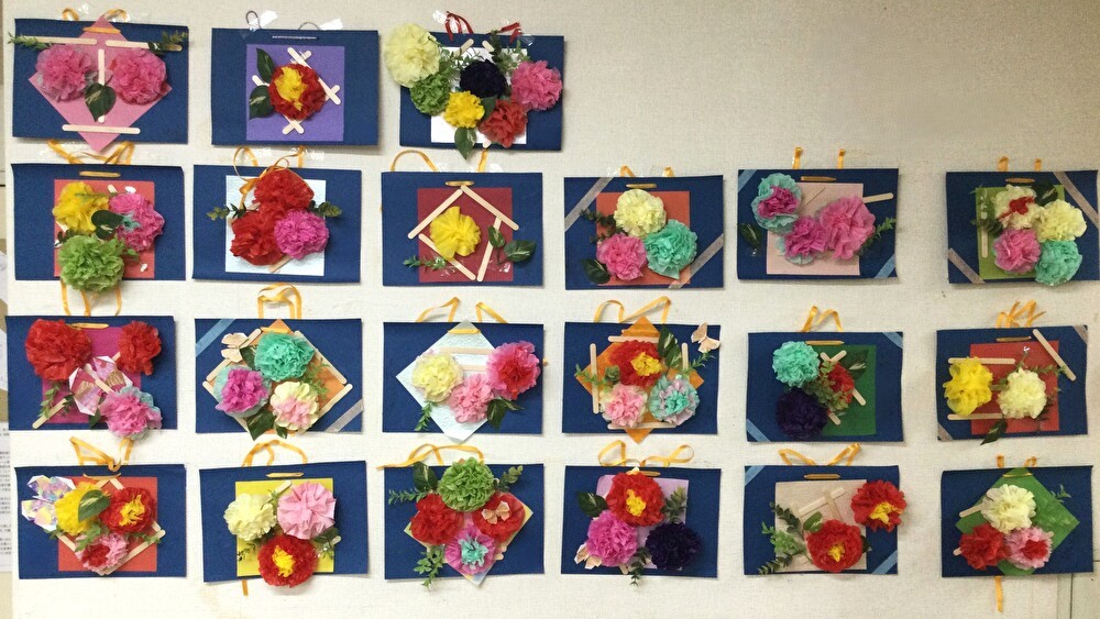 皆様の作品を壁に並べると、色とりどりのお花が咲き乱れました。