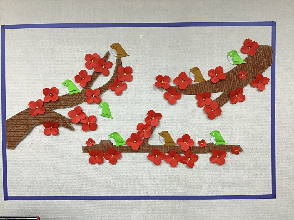 2月の壁面飾りは、梅の花・ウグイス・メジロです