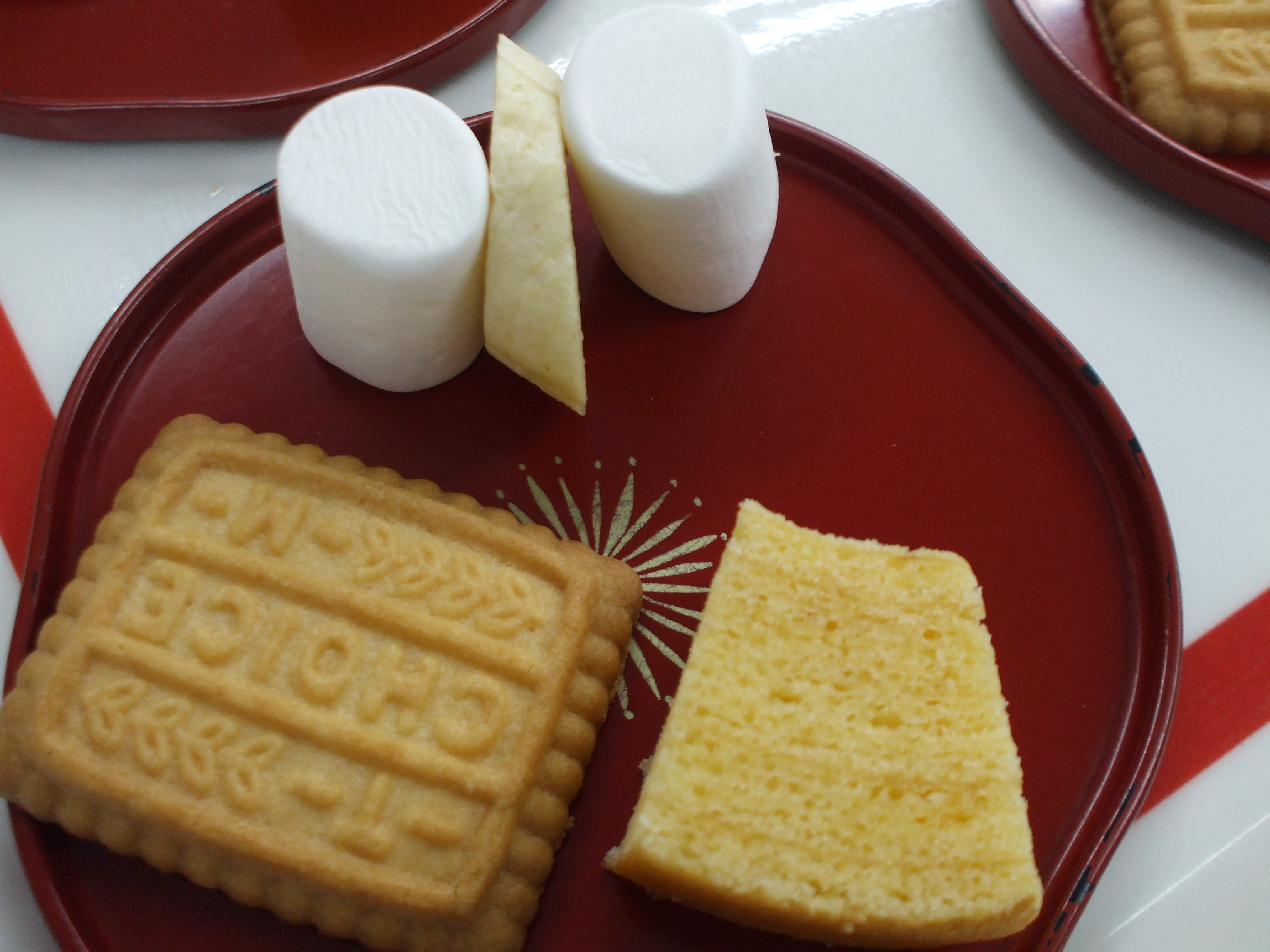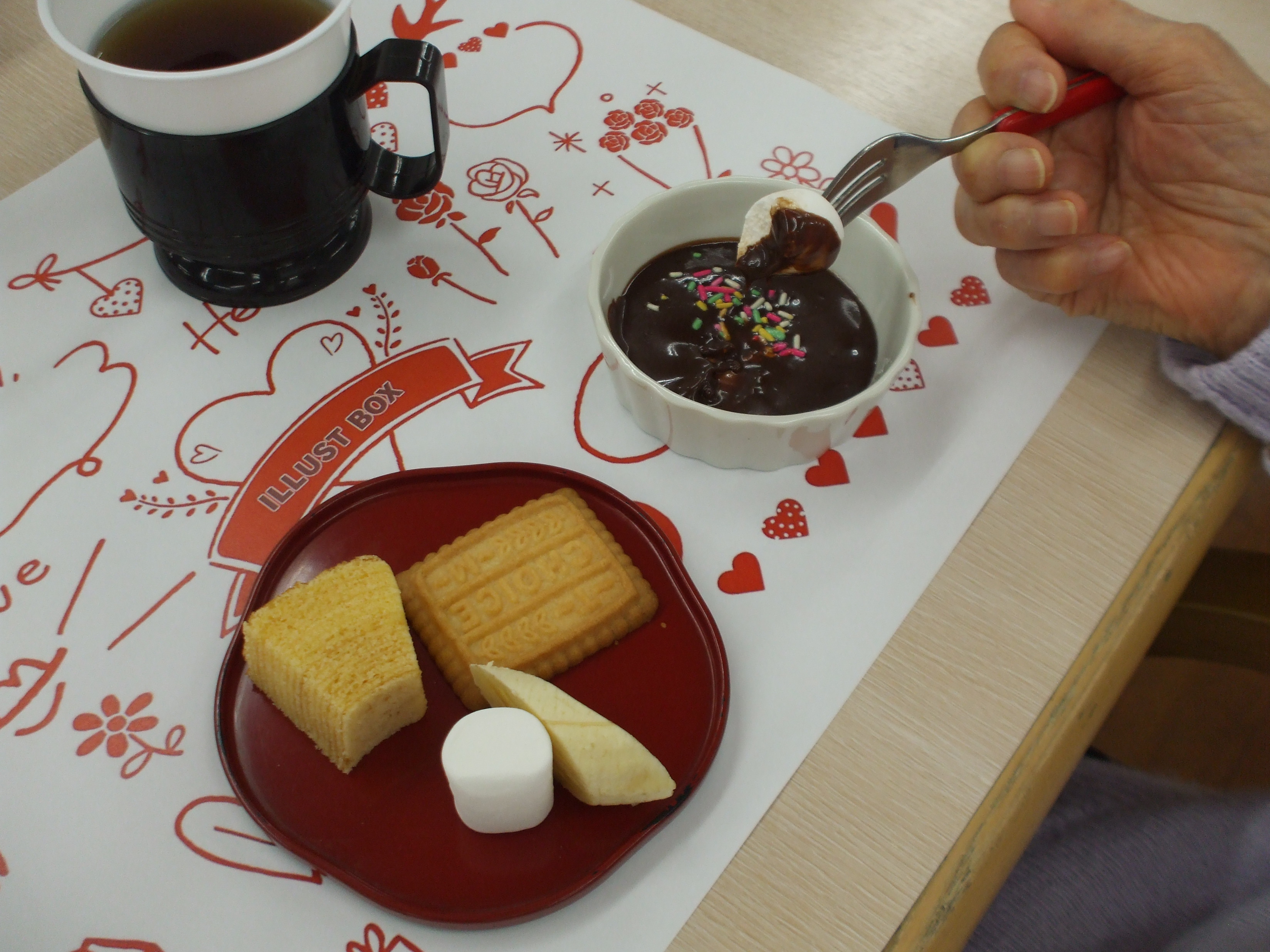 バレンタインデーは春を感じさせる暖かい日になりましたね。日暮里では週末の2日間を「皆様に日頃の感謝を伝える日」として、介護チームの皆が考えて、おやつにちょっとひと工夫してみました。バナナ・マシュマロ・チョイス・バウムクーヘンを・・