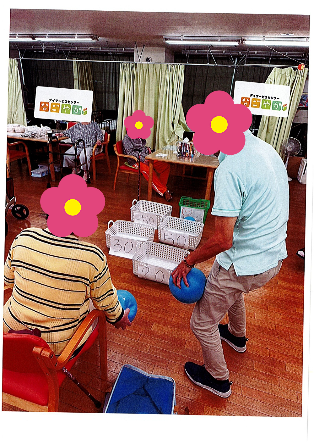 個別機能訓練で使用している、ゴムボールを使って、ボール投げを行いました。