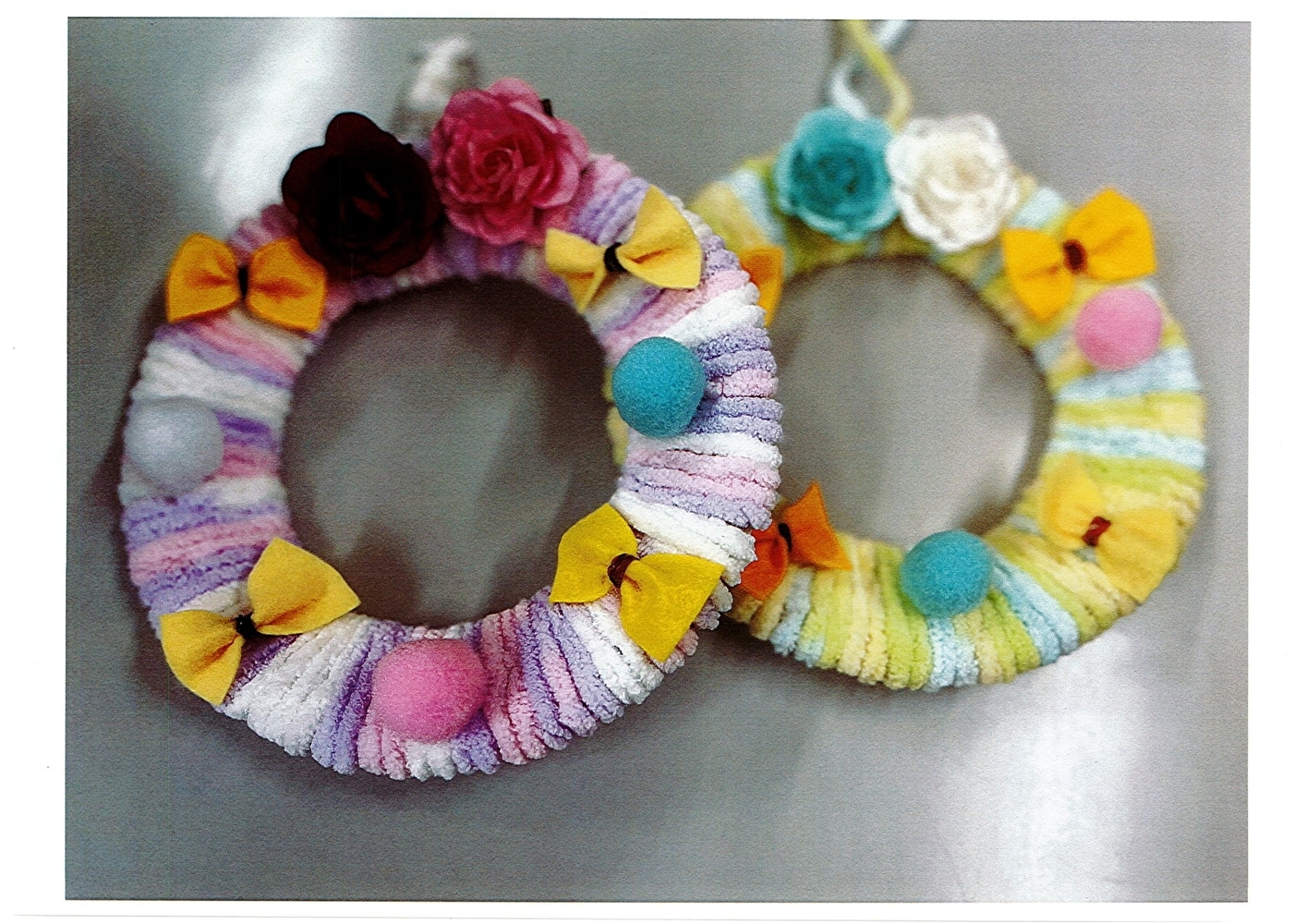 紙皿に、毛糸をひと巻き、ひと巻き頂き、フエルトで作ったリボンを付けました。