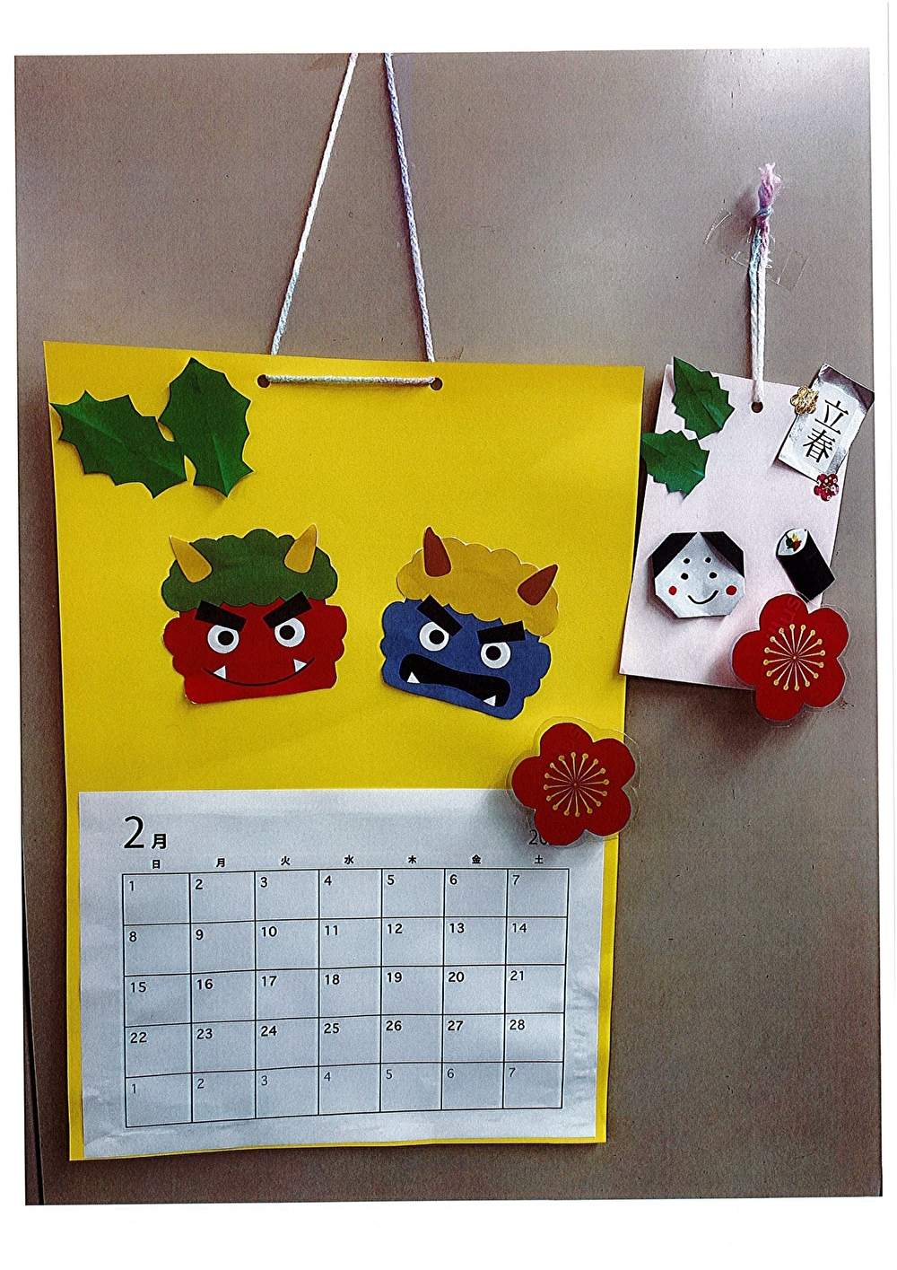 2月に向けて、切る・折る・貼るといった作業を日々行っていただき、2月のカレンダーが完成しました。「鬼は〜外!!福は〜うち!!」
