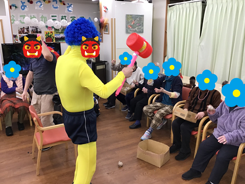 なごやか三軒茶屋では、2月3日は節分ということで、豆まきイベントを行いました。1週間前からみなさんに丸めてもらった新聞ボールと小袋に入った甘納豆を職員扮する鬼めがけて、