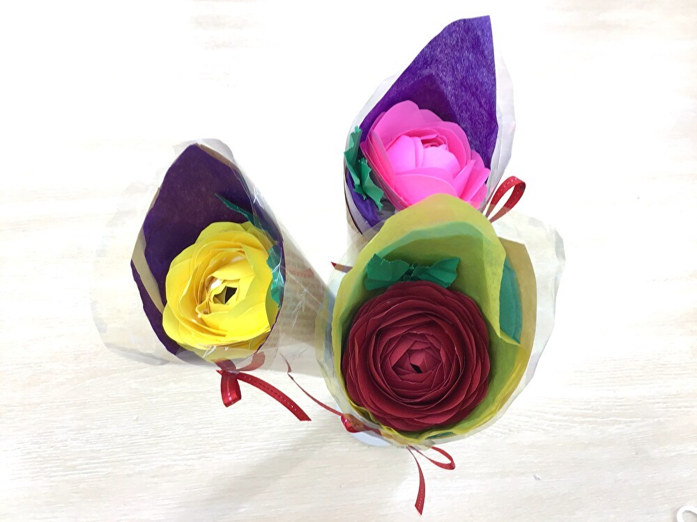 指の運動を兼ねた創作レクリエーションとして、「バラのブーケ」を作りました!