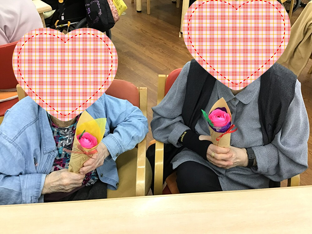 指の運動を兼ねた創作レクリエーションとして、「バラのブーケ」を作りました!折り紙で花びらを作り、それを30枚ほどボンドで貼り付け、とても素敵なブーケが出来上がりました!