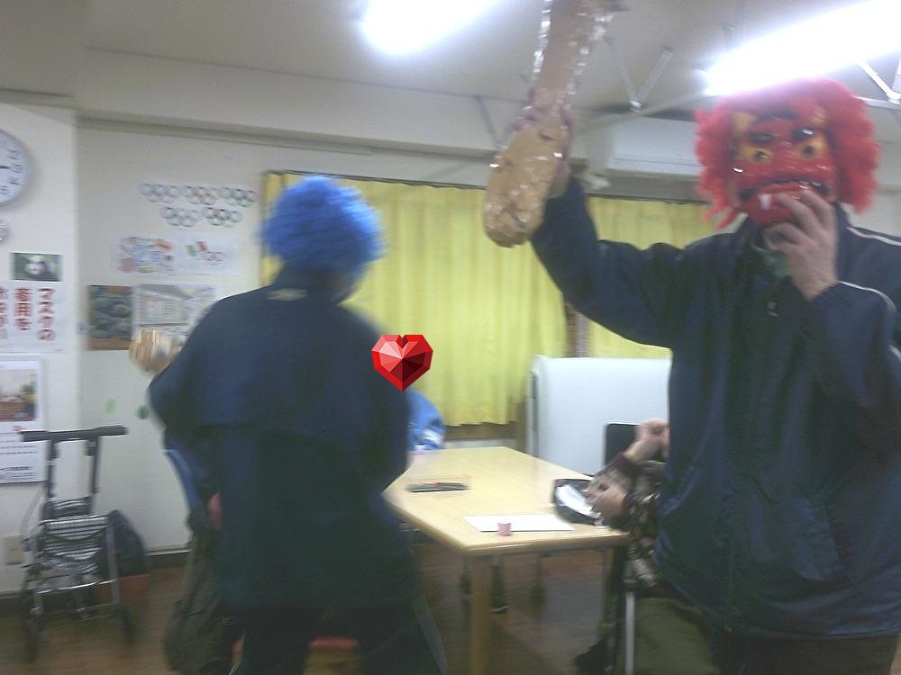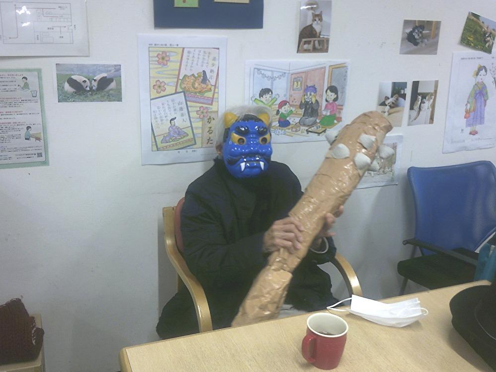 職員たちの鬼の仮装が気になったのか鬼の面とこん棒を着けたがる方も…
