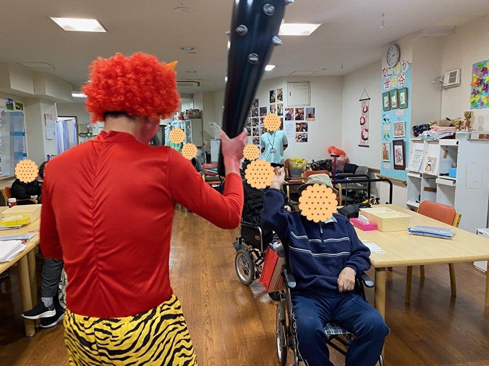 おやつ間近の2時30分、突如、棍棒を担いだ全身真っ赤な鬼が登場。
