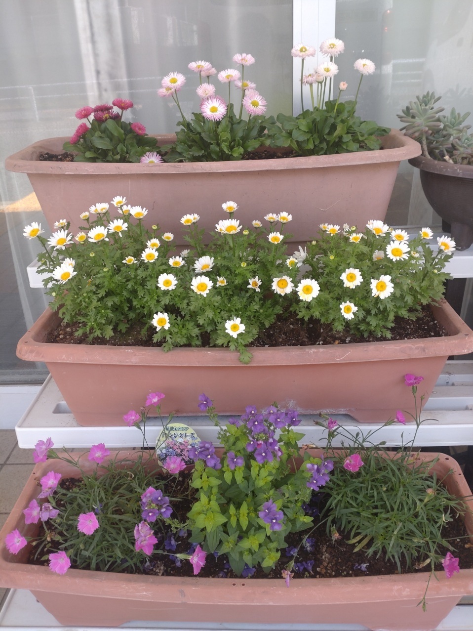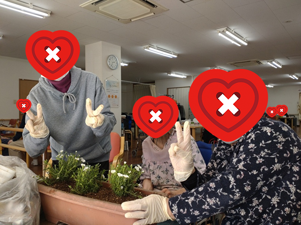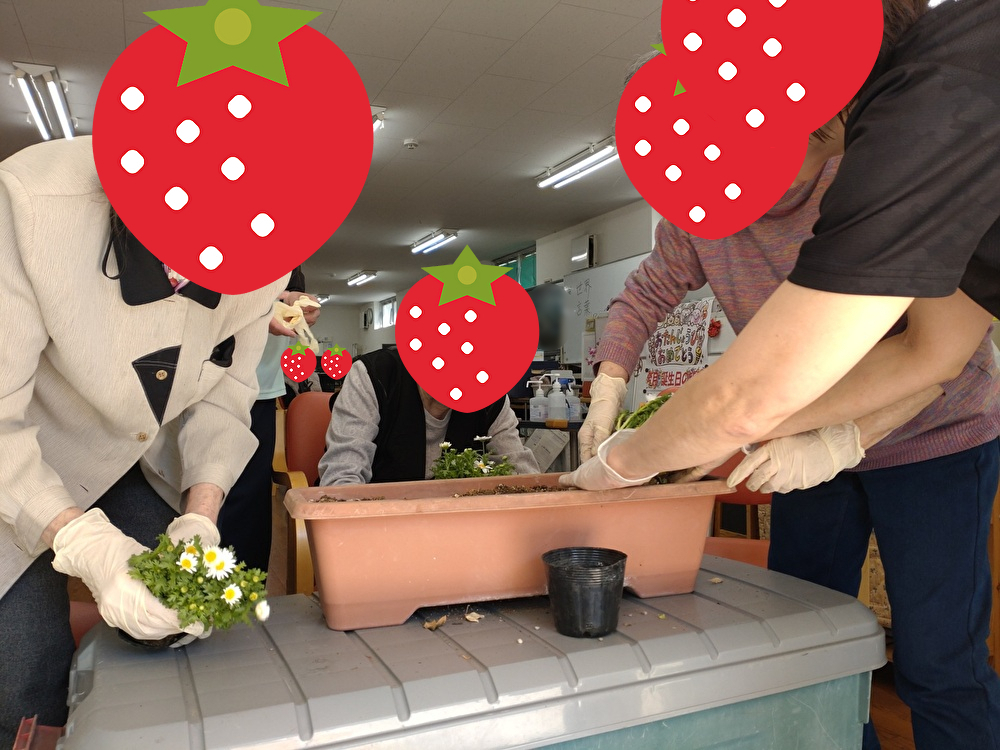 施設前のプランターにお花を植えました。施設前が華やかになり、みんなで成長を楽しみに見守っています。