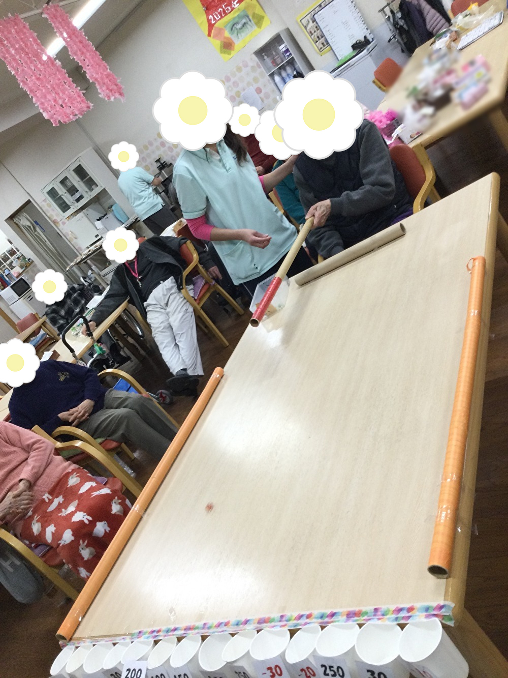 本日は、筒の中にビー玉を入れ、転がった先に得点を書いたカップがあり、その合計を競うゲームを行いました。