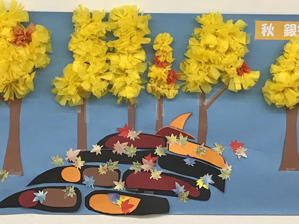 11月の「なごやか墨田」は制作活動に没頭し黄金色のイチョウの葉と紅葉散る素敵な壁画を仕上げました。