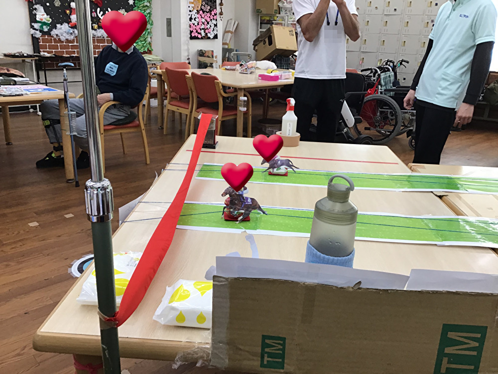 今回、なごやか砂町で競馬レースを開催いたしました!糸を巻いていくと馬がゴールに向かって進んでいく仕掛けです。