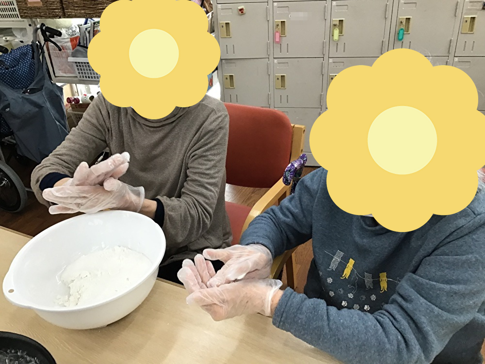 3月前半はホワイトデーのイベントを行いました!甘〜いおしるこを手作りです。ご利用者様にも白玉粉を丸めていただくお手伝いをしていただきました。