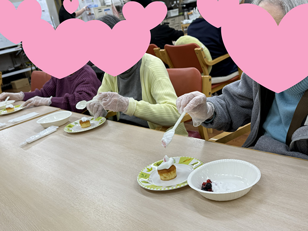 なごやか用賀では、クリスマスケーキ作りを行いました😋マフィンに生クリームとフルーツ、カラースプレーを乗せて完成!