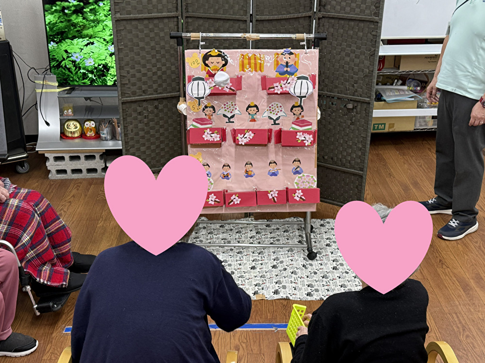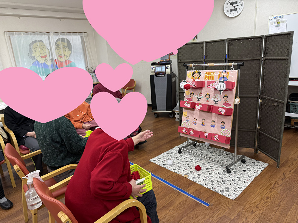 どんよりとした天気を吹き飛ばすために、3/2〜3/7まで「ひな祭りゲーム」を行っています😀引っ掛けた箱に紅白の玉を入れていくゲームです。