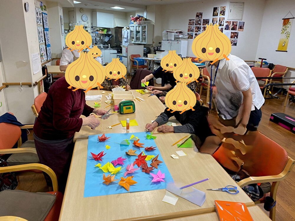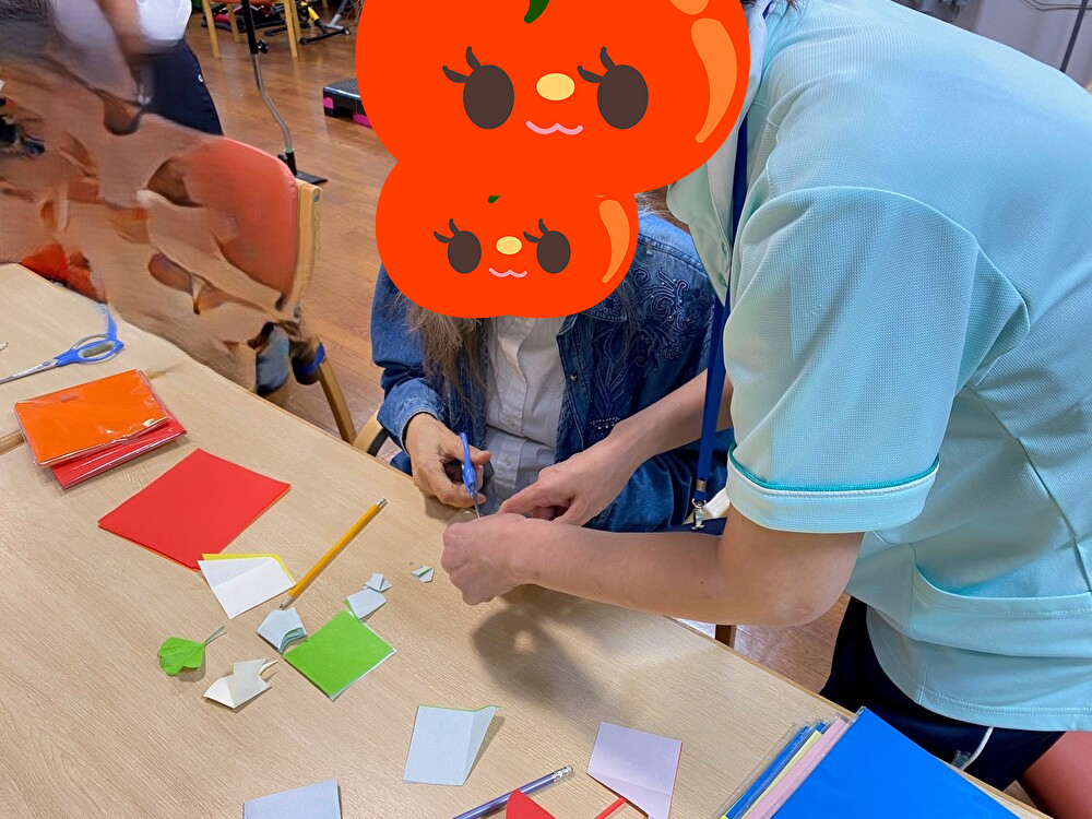 今日のレクは、「折り紙教室」。イチョウ、モミジの葉を折っていただきました。